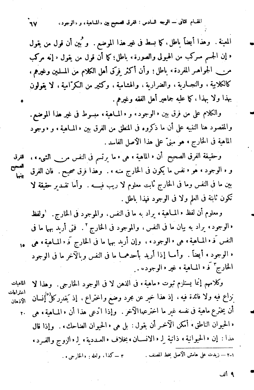 ومعلوم أن لفظ الماهية يراد به ما في النفس والموجود في الخارج ولفظ الوجود يراد به بيان ما في النفس والموجود في الخارج فمتى أريد بهما ما في النفس ف الماهية هي الوجود وإن أريد بهما ما في الخارج ف الماهية هي الوجود أيضا وأما إذا بأحدهما ما في النفس وبالآخر ما في الوجود الخارج ف الماهية غير الوجود.