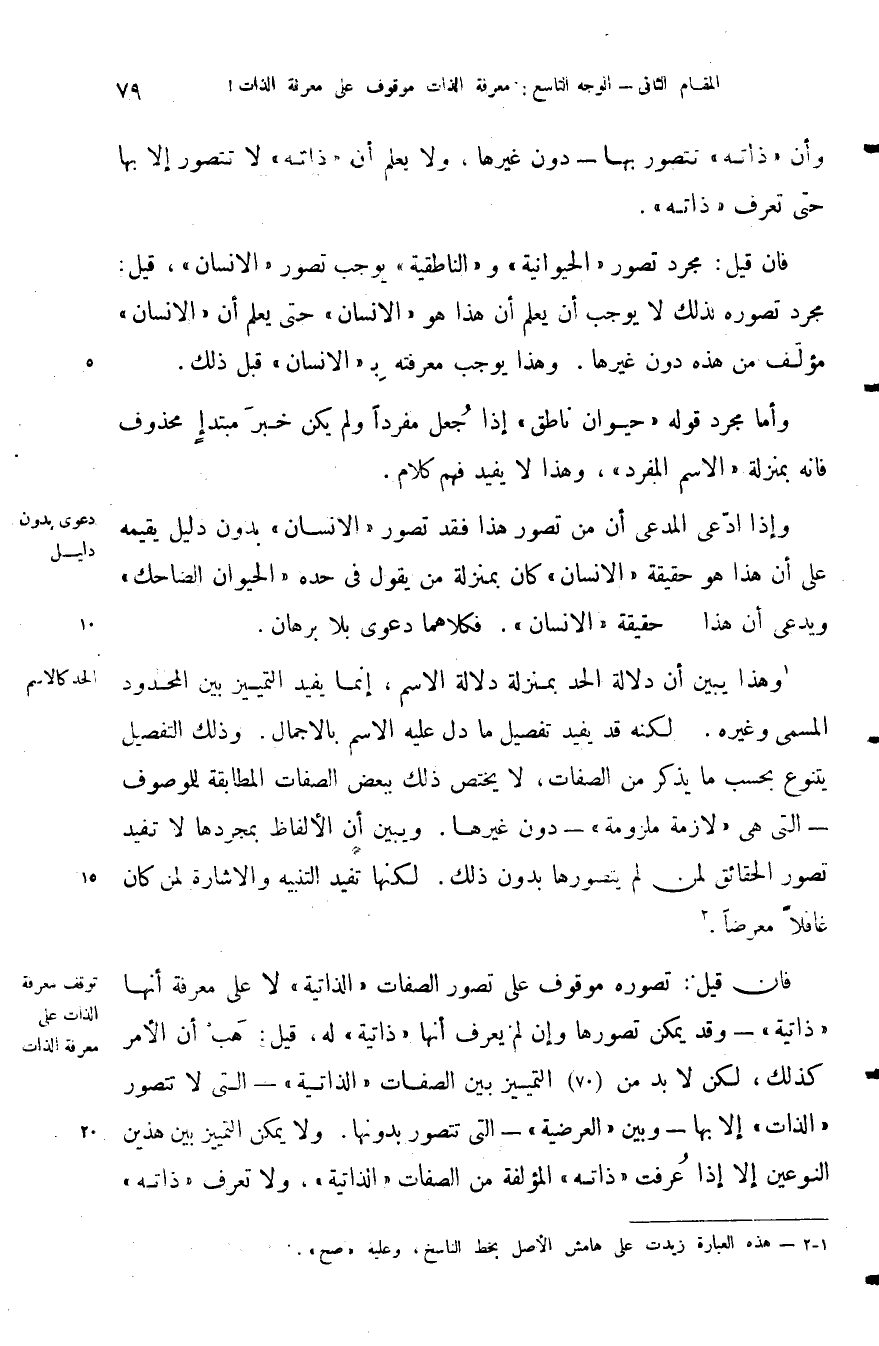فان قيل تصوره موقوف على تصور الصفات الذاتية لا على معرفة أنها ذاتية وقد يمكن تصورها وإن لم يعرف أنها ذاتية له قيل هب أن الأمر كذلك لكن لا بد من التمييز بين الصفات الذاتية التي لا تتصور الذات إلا بها وبين العرضية التي تتصور بدونها ولا يمكن التمييز بين هذين النوعين إلا إذا عرفت ذاته المؤلفة من الصفات الذاتية ولا تعرف ذاته