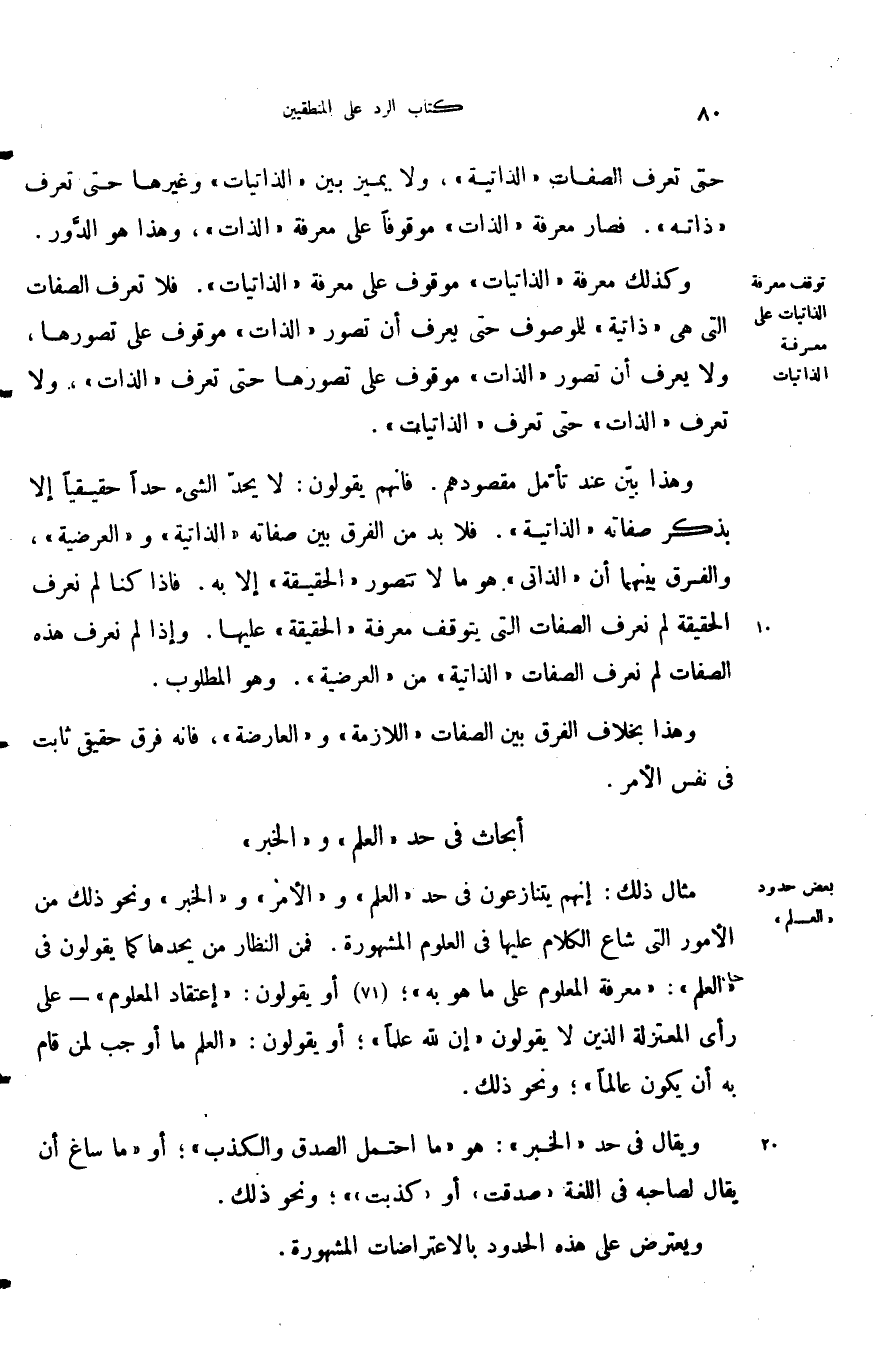 وكذلك معرفة الذاتيات موقوف على معرفة الذاتيات فلا تعرف الصفات التي هي ذاتية للموصوف حتى تعرف أن تصور الذات موقوف على تصورها ولا يعرف أن تصور الذات موقوف على تصورها حتى تعرف الذات ولا تعرف الذات حتى تعرف الذاتيات وهذا بين عند تأمل مقصودهم فإنهم يقولون لا يحد الشيء حدا حقيقيا إلا بذكر صفاته الذاتية فلا بد من الفرق بين صفاته الذاتية والعرضية والفرق بينهما أن الذاتي هو ما لا تتصور الحقيقة إلا به فإذا كنا لم نعرف الحقيقة لم نعرف الصفات التي يتوقف معرفة الحقيقة عليها وإذا لم نعرف هذه الصفات لم نعرف الصفات الذاتية من العرضية وهو المطلوب.