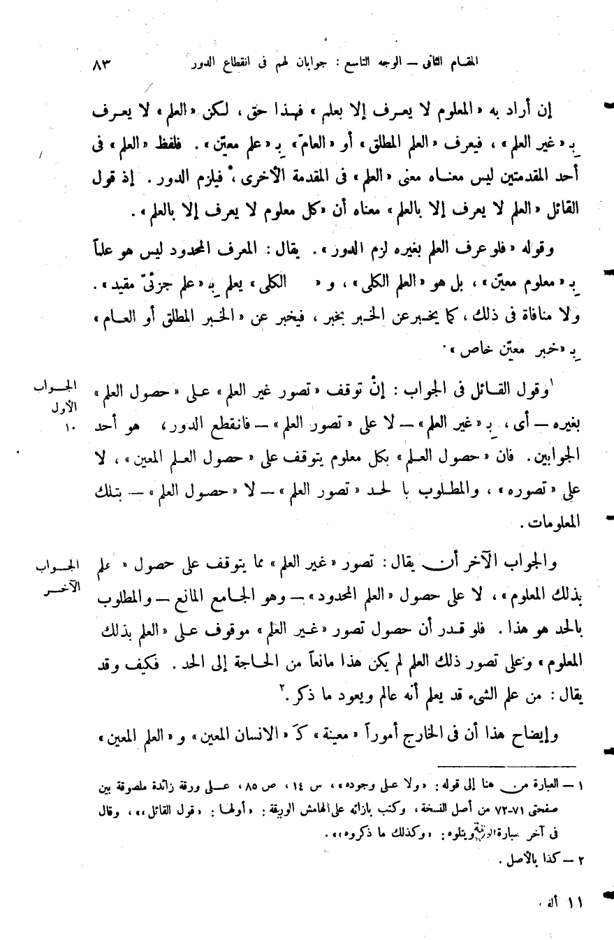 وقوله فلو عرف العلم بغيره لزم الدور يقال المعرف المحدود ليس هو علما بمعلوم معين بل هو العلم الكلي والعلم الكلي يعلم بعلم جزئي مقيد ولا منافاة في ذلك كما يخبر عن الخبر بخبر فيخبر عن الخبر المطلق أو العام بخبر معين خاص.