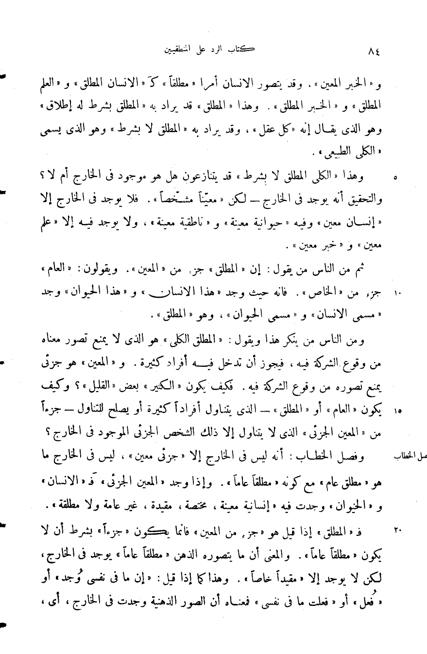 ومن الناس من ينكر هذا ويقول المطلق الكلى هو الذي لا يمنع تصور معناه من وقوع الشركة فيه فيجوز أن تدخل فيه أفراد كثيرة والمعين هو جزئي يمنع تصوره من وقوع الشركة فيه فكيف يكون الكبير بعض القليل وكيف يكون العام أو المطلق الذي يتناول أفرادا كثيرة أو يصلح ليتناول جزءا من المعين الجزئي الذي لا يتناول إلا ذلك الشخص الجزئي الموجود في الخارج.