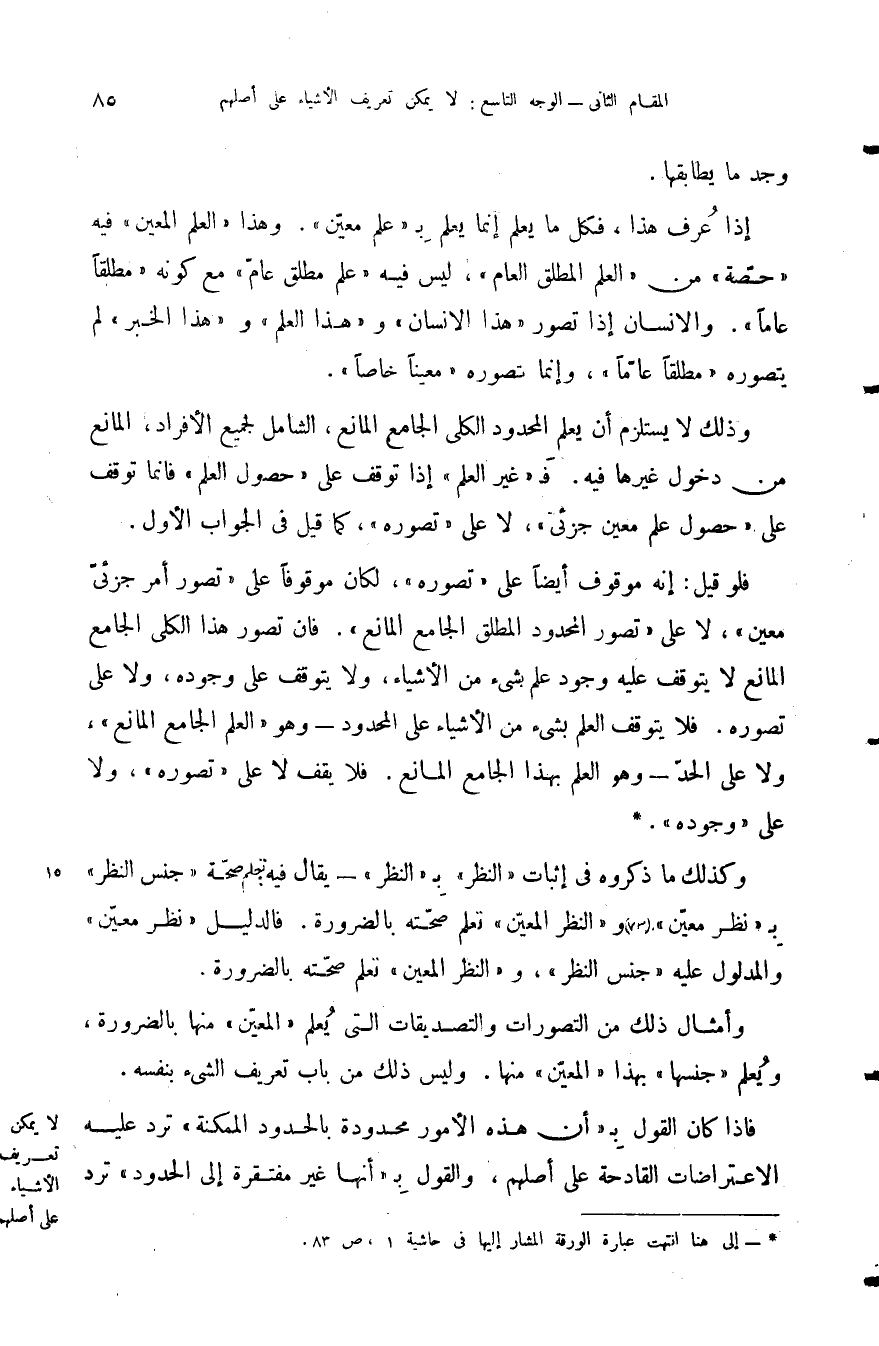 فلو قيل أنه موقوف أيضا على تصوره لكان موقوفا على تصور أمر جزئي معين لا على تصور المحدود المطلق الجامع المانع فان تصور هذا الكلى الجامع المانع لا يتوقف عليه وجود علم شيء من الأشياء ولا يتوقف على وجوده ولا على تصوره فلا يتوقف العلم بشيء من الأشياء على المحدود وهو العلم الجامع المانع ولا على الحد وهو العلم بهذا الجامع المانع فلا يقف لا على تصوره ولا على وجوده.