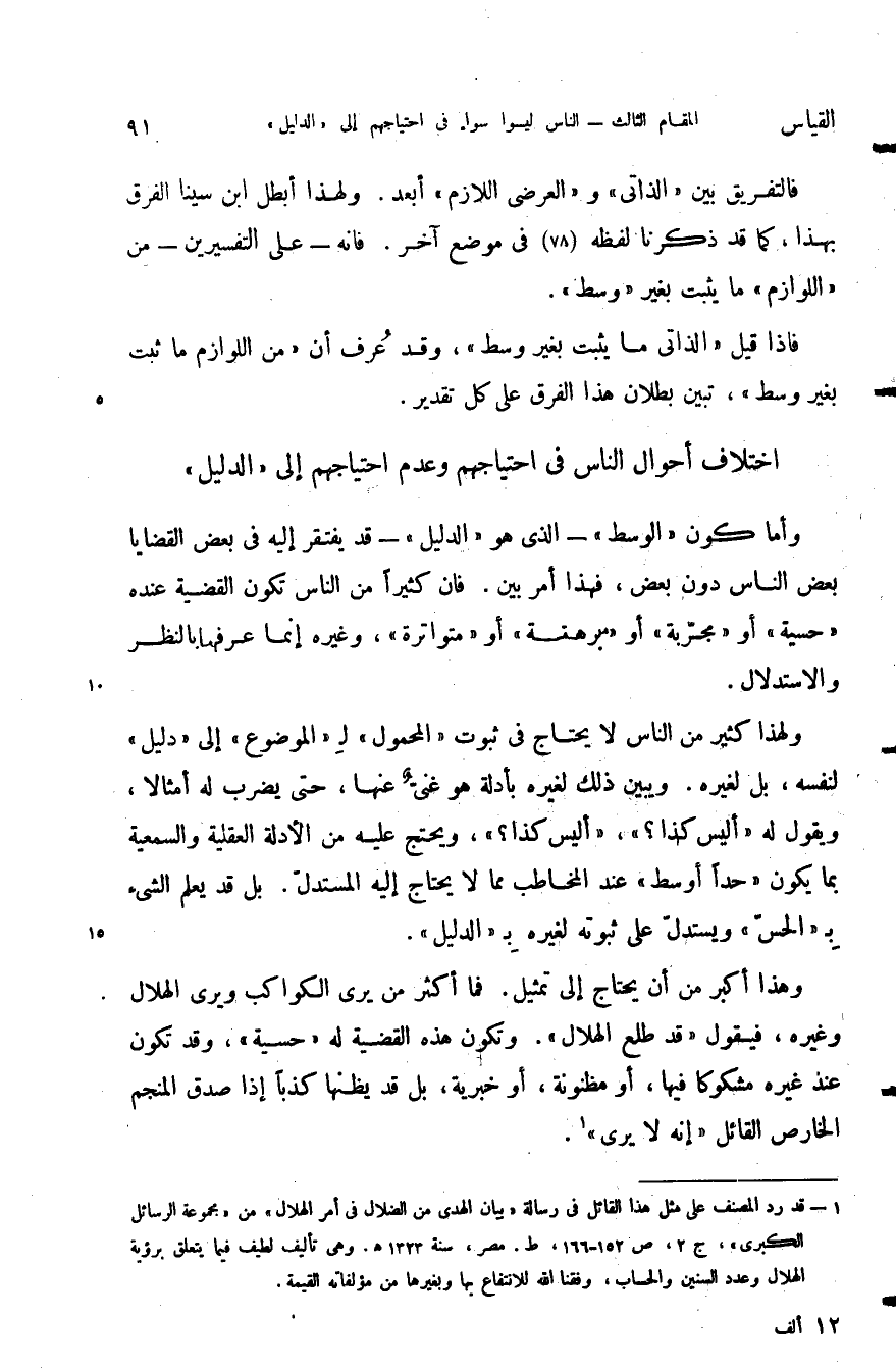 وأما كون الوسط الذي هو الدليل قد يفتقر إليه في بعض القضايا بعض الناس دون بعض فهذا أمر بين فان كثيرا من الناس تكون القضية عنده حسية أو مجربة أو برهانية أو متواترة وغيره إنما عرفه بالنظر والاستدلال.