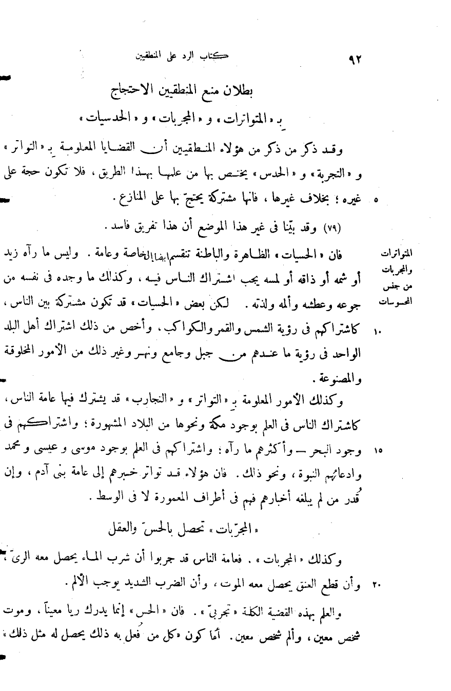 وقد ذكر من ذكر من هؤلاء المنطقيين أن القضايا المعلومة ب التواتر والتجربة والحدس يختص بها من علمها بهذه الطريق فلا تكون حجة على غيره بخلاف غيرها فإنها مشتركة يحتج بها على المنازع.