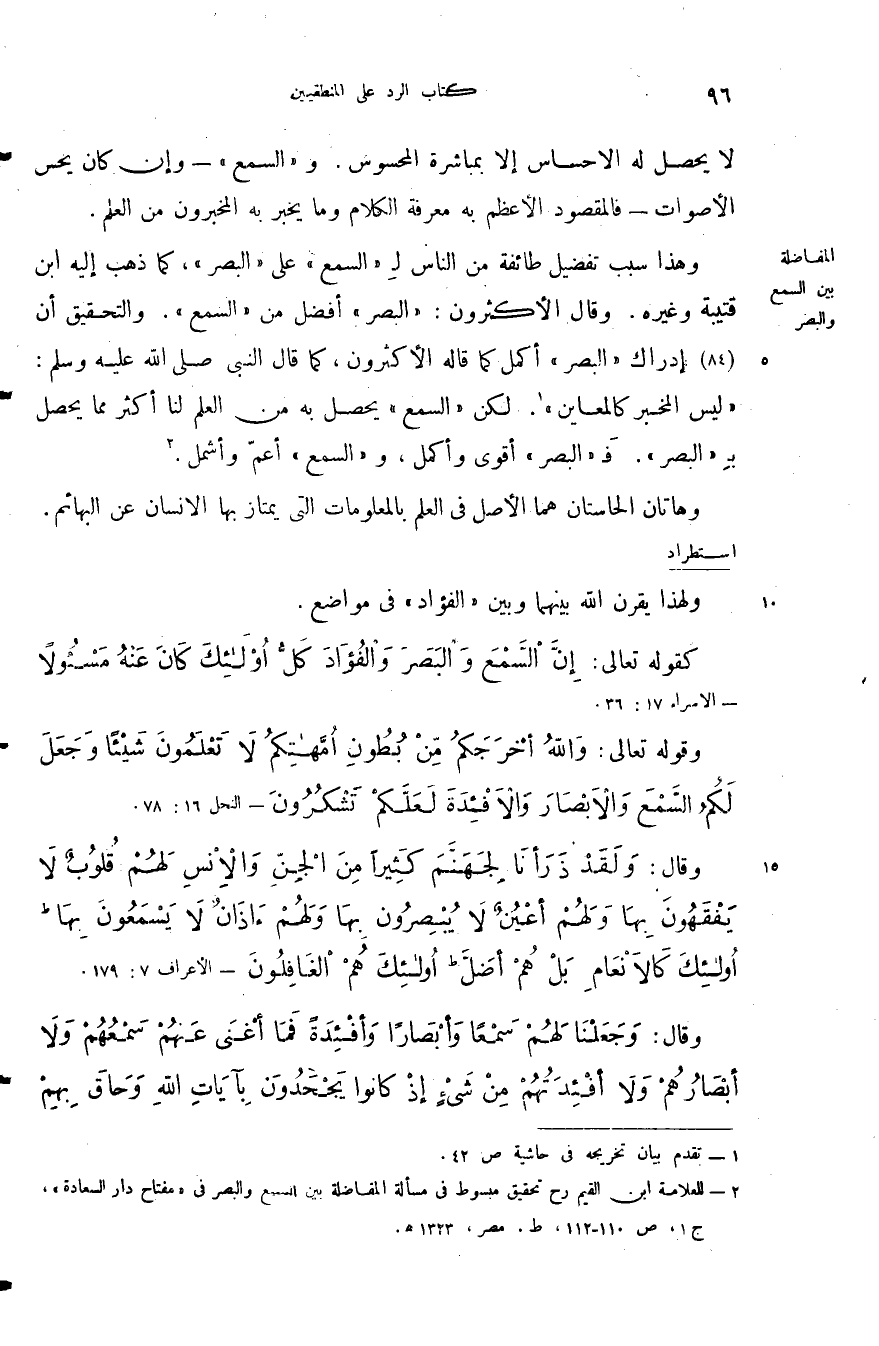 وهذا سبب تفضيل طائفة من الناس ل السمع على البصر كما ذهب إليه ابن قتيبة وغيره وقال الأكثرون البصر أفضل من السمع والتحقيق أن إدراك البصر أكمل كما قاله الأكثرون كما قال النبي صلى الله عليه وسلم: "ليس المخبر كالمعاين" لكن السمع يحصل به من العلم لنا أكثر مما يحصل بالبصر ف البصر أقوى وأكمل والسمع أعم وأشمل.