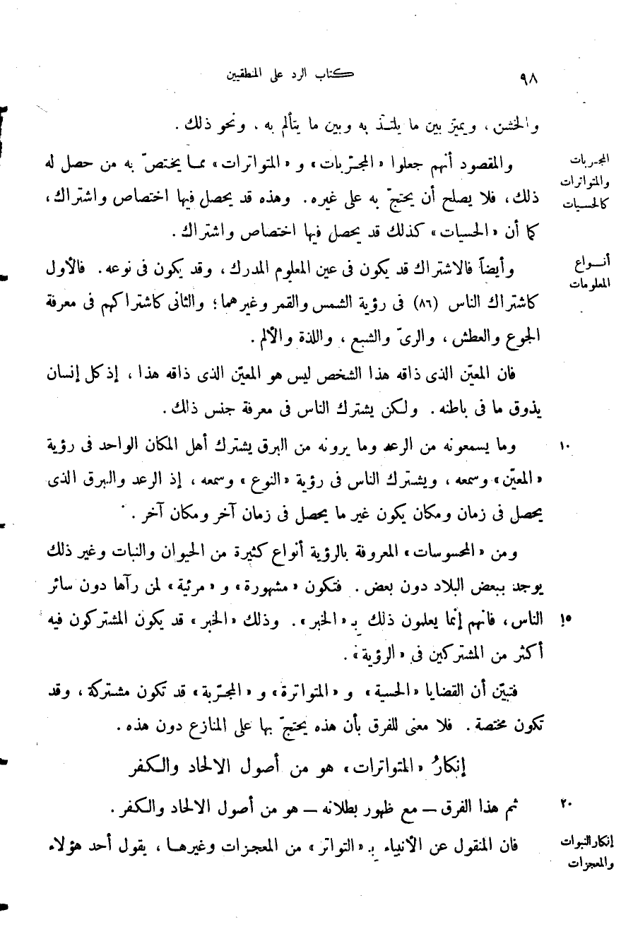 ومن المحسوسات المعروفة بالرؤية أنواع كثيرة من الحيوان والنبات وغير ذلك يوجد ببعض البلاد دون بعض فتكون مشهورة ومرئية لمن رآها دون سائر الناس فإنهم إنما يعلمون ذلك ب الخبر وذلك الخبر قد يكون المشتركون فيه أكثر من المشتركين في الرؤية.