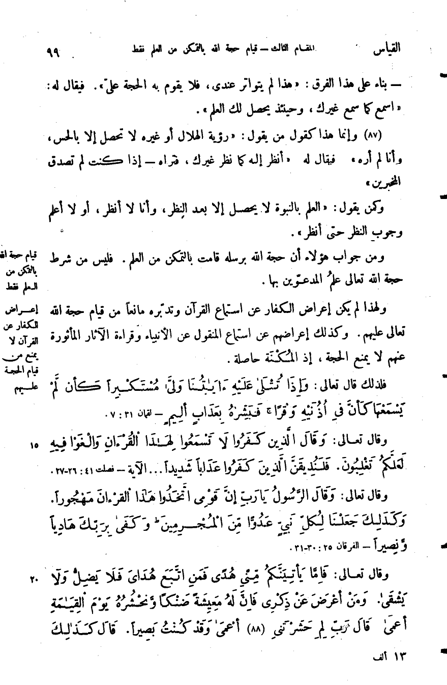 ولهذا لم يكن إعراض الكفار عن استماع القرآن وتدبره مانعا من قيام حجة الله تعالى عليهم وكذلك إعراضهم عن استماع المنقول عن الأنبياء وقراءة الآثار المأثورة عنهم لا يمنع الحجة إذ المكنة حاصلة.