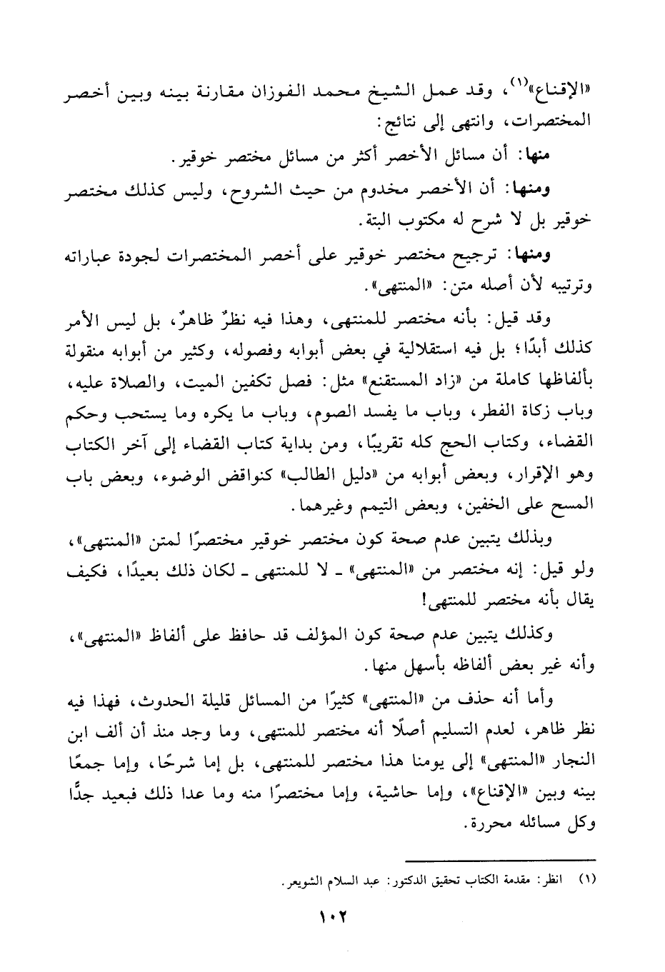 وأما أنه حذف من " المنتهى " كثيرا من المسائل قليلة الحدوث، فهذا فيه نظر ظاهر، لعدم التسليم أصلا أنه مختصر للمنتهى، وما وجد منذ أن ألف ابن النجار " المنتهى " إلى يومنا هذا مختصر للمنتهى، بل إما شرحا، وإما جمعا بينه وبين "الإقناع"، وإما حاشية، وإما مختصراً منه وما عدا ذلك فبعيد جدا وكل مسائله محررة.