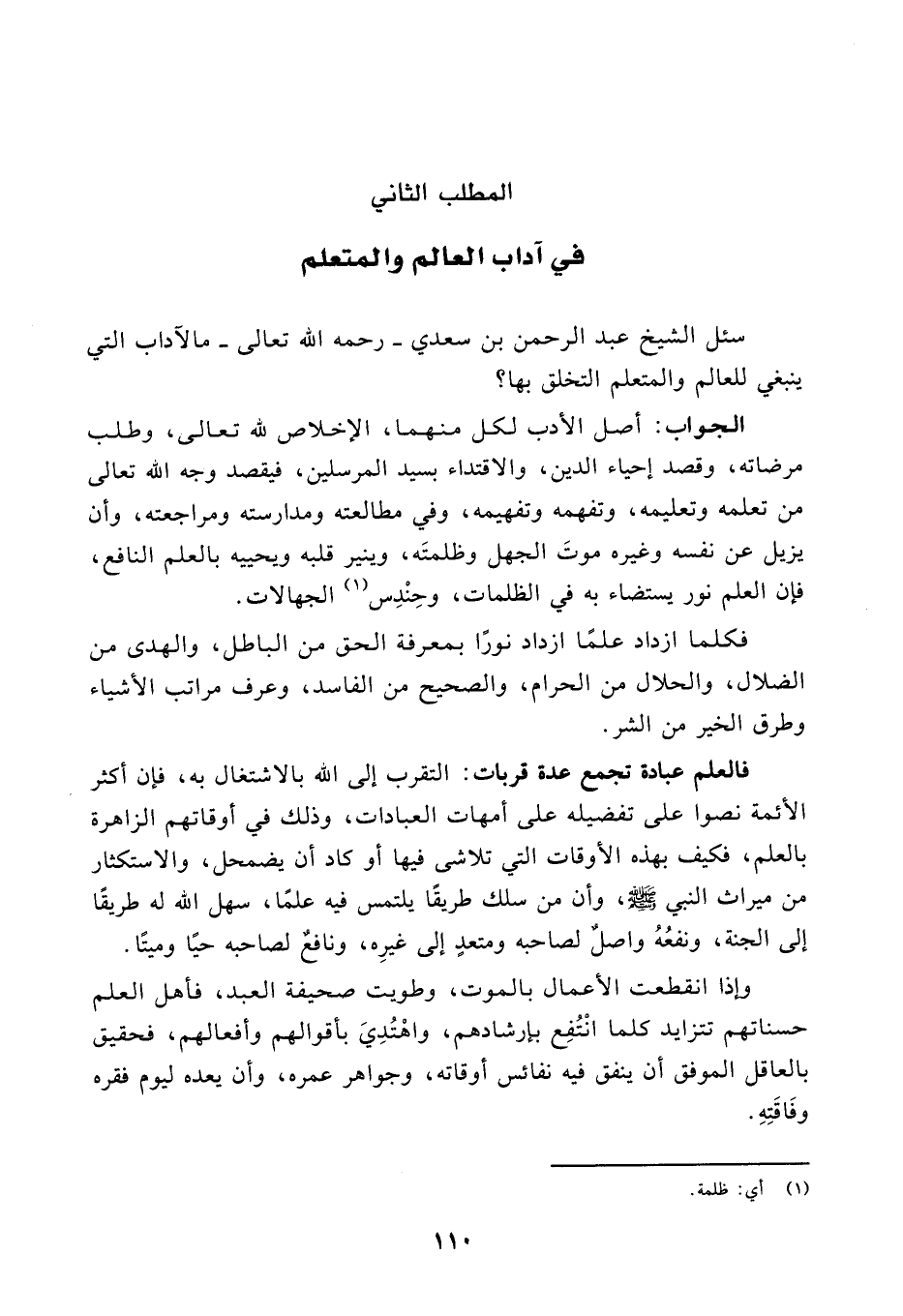 سئل الشيخ عبدالرحمن بن سعدي -رحمه الله تعالى- مالآداب التي ينبغي للعالم والمتعلم التخلق بها؟