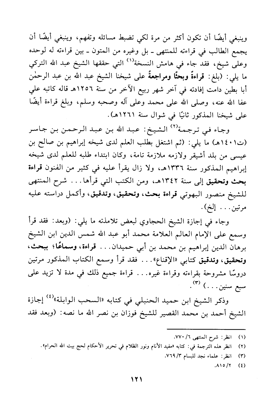 وينبغي أيضاً أن تكون أكثر من مرة لكي تضبط مسائله وتفهم، وينبغي أيضاً أن يجمع الطالب في قراءته للمنتهى - بل وغيره من المتون- بين قراءته له لوحده وعلى شيخ، فقد جاء في هامش النسخة (¬١) التي حققها الشيخ عبدالله التركي ما يلي: (بلغ: قراءةً وبحثاً ومراجعةً على شيخنا الشيخ عبدالله بن عبدالرحمن أبا بطين دامت إفادته في آخر شهر ربيع الآخر من سنة ١٢٥٦ هـ قاله كاتبه علي عفا الله عنه، وصلى الله على محمد وعلى آله وصحبه وسلم، وبلغ قراءة أيضاً على شيخنا المذكور ثانياً في شوال سنة ١٢٦١ هـ).