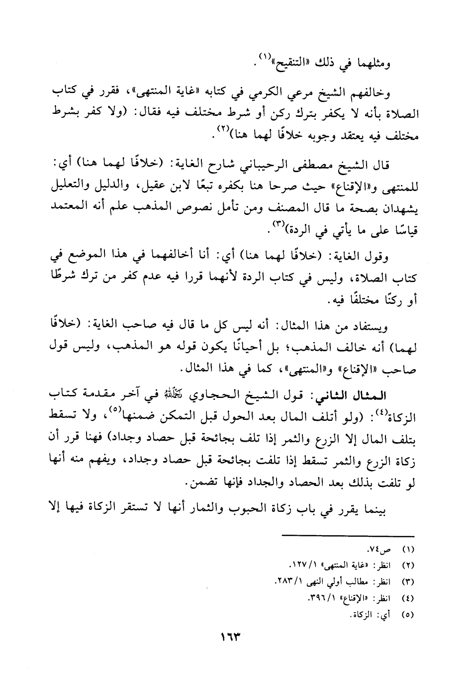 المثال الثاني: قول الشيخ الحجاوي - رحمه الله - في آخر مقدمة كتاب الزكاة (¬٤): (ولو أتلف المال بعد الحول قبل التمكن ضمنها (¬٥)، ولا تسقط بتلف المال إلا الزرع والثمر إذا تلف بجائحة قبل حصاد وجداد) فهنا قرر أن زكاة الزرع والثمر تسقط إذا تلفت بجائحة قبل حصاد وجداد، ويفهم منه أنها لو تلفت بذلك بعد الحصاد والجداد فإنها تضمن.