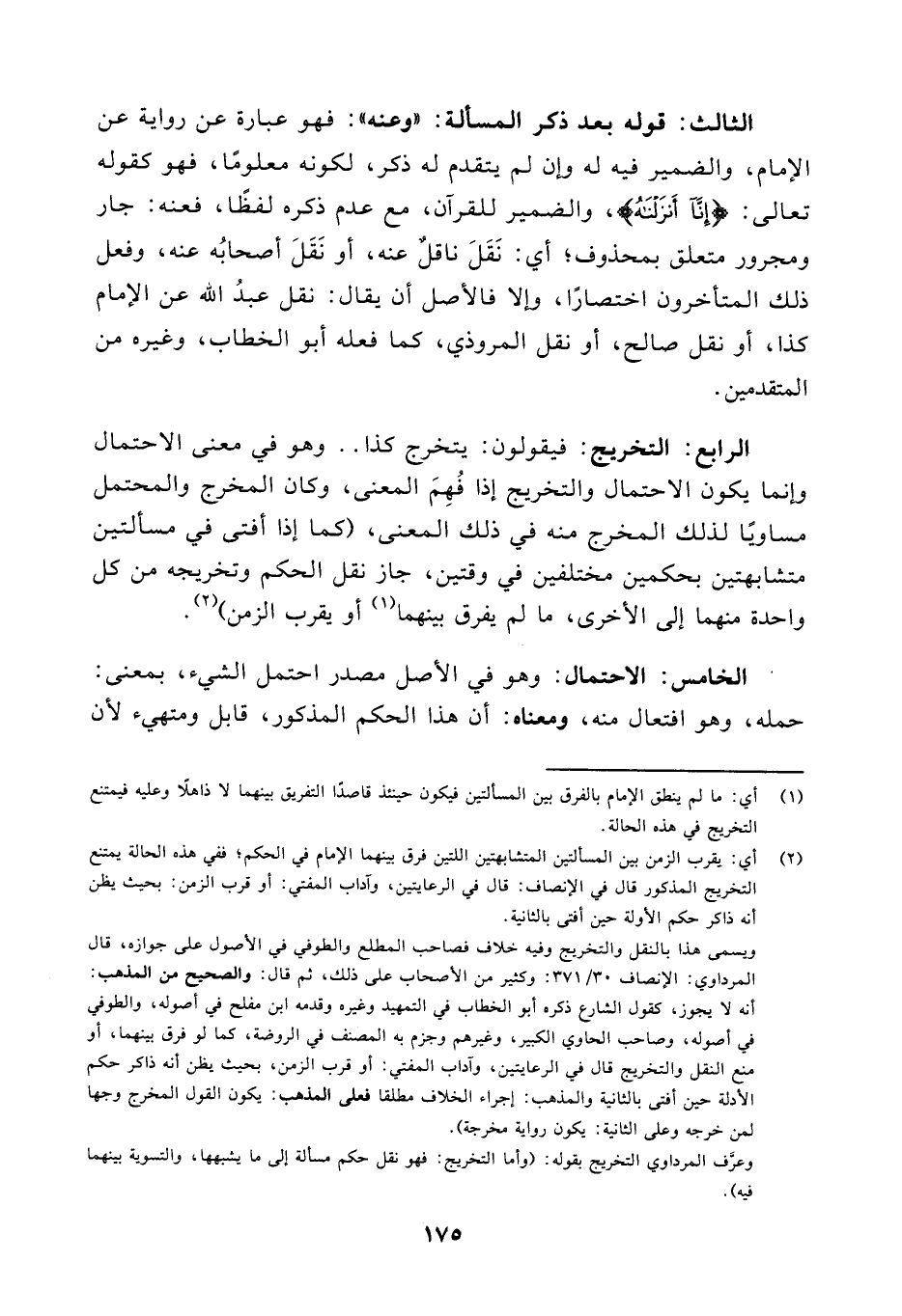 الرابع: التخريج: فيقولون: يتخرج كذا، .. وهو في معنى الاحتمال وإنما يكون الاحتمال والتخريج إذا فُهِمَ المعنى، وكان المخرج والمحتمل مساويا لذلك المخرج منه في ذلك المعنى، (كما إذا أفتى في مسالتين متشابهتين بحكمين مختلفين في وقتين، جاز نقل الحكم وتخريجه من كل واحدة منهما إلى الأخرى، ما لم يفرق بينهما (¬١) أو يقرب الزمن (¬٢)).
