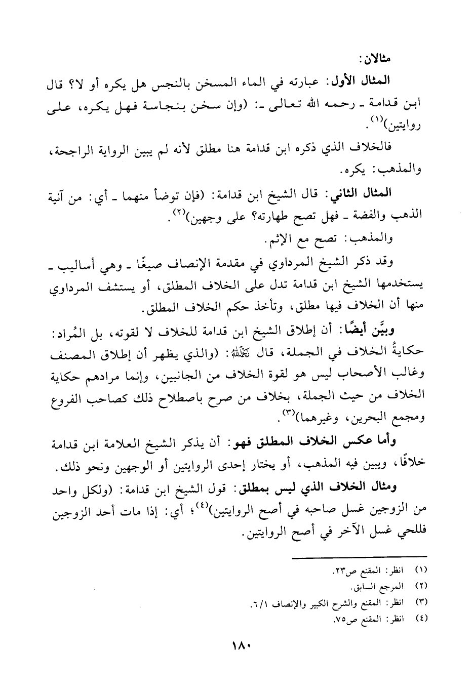 وقد ذكر الشيخ المرداوي في مقدمة الإنصاف صيغا - وهي أساليب - يستخدمها الشيخ ابن قدامة تدل على الخلاف المطلق، أو يستشف المرداوي منها أن الخلاف فيها مطلق، وتأخذ حكم الخلاف المطلق.