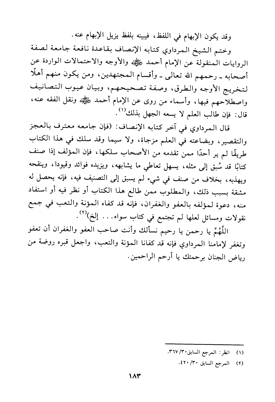 قال المرداوي في آخر كتابه الإنصاف: (فإن جامعه معترف بالعجز والتقصير، وبضاعته في العلم مزجاة، ولاسيما وقد سلك في هذا الكتاب طريقا لم ير أحدا ممن تقدمه من الأصحاب سلكها، فإن المؤلف إذا صنف كتابا قد سُبق إلى مثله، يسهل تعاطي ما يشابهه، ويزيده فوائد وقيودا، وينقحه ويهذبه، بخلاف من صنف في شيء لم يسبق إلى التصنيف فيه، فإنه يحصل له مشقة بسبب ذلك، والمطلوب ممن طالع هذا الكتاب أو نظر فيه أو استفاد منه، دعوة لمؤلفه بالعفو والغفران، فإنه قد كفاه المؤنة والتعب في جمع نقولات ومسائل لعلها لم تجتمع في كتاب سواه ... الخ) (¬٢)