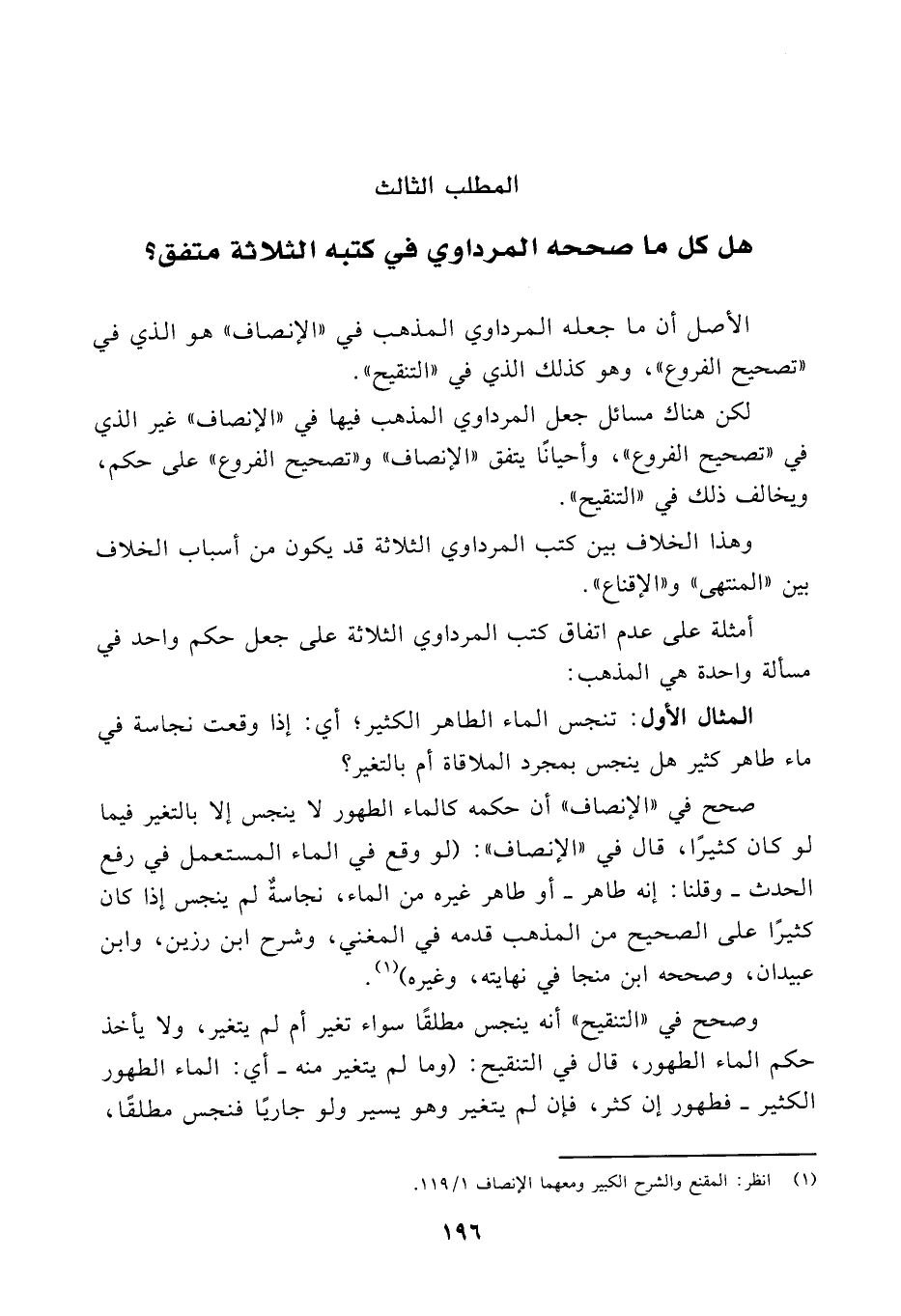 لكن هناك مسائل جعل المرداوي المذهب فيها في " الإنصاف " غير الذي في " تصحيح الفروع "، وأحياناً يتفق " الإنصاف " و " تصحيح الفروع " على حكم، ويخالف ذلك في " التنقيح ".