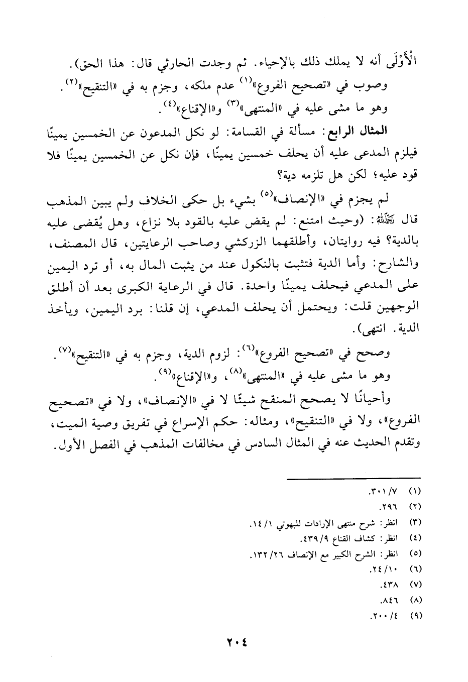 وأحيانا لا يصحح المنقح شيئا لا في "الإنصاف"، ولا في "تصحيح الفروع"، ولا في "التنقيح"، ومثاله: حكم الإسراع في تفريق وصية الميت، وتقدم الحديث عنه في المثال السادس في مخالفات المذهب في الفصل الأول.