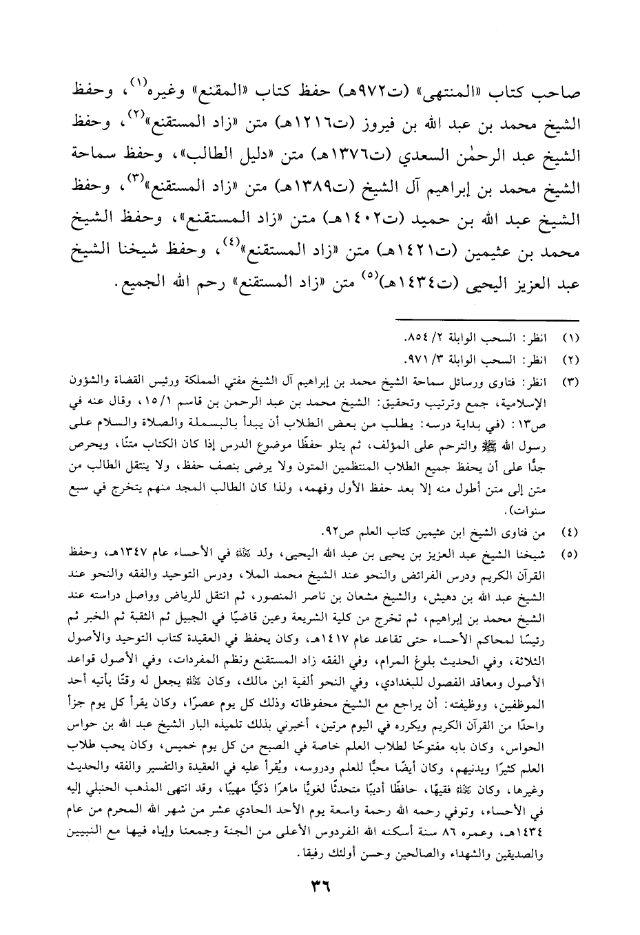 وحفظ الشيخ عبدالله بن حميد (ت ١٤٠٢ هـ) متن " زاد المستقنع "، وحفظ الشيخ محمد بن عثيمين (ت ١٤٢١ هـ) متن " زاد المستقنع " (¬٤)، وحفظ شيخنا الشيخ عبدالعزيز اليحيى (ت ١٤٣٤ هـ) (¬٥) متن " زاد المستقنع "رحم الله الجميع.