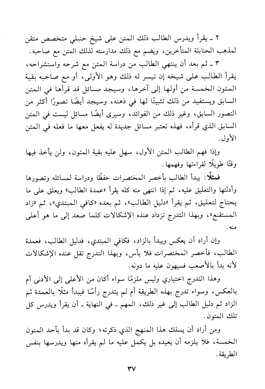 ٢ - يقرأ ويدرس الطالب ذلك المتن على شيخ حنبلي متخصص متقن لمذهب الحنابلة المتأخرين، ويضم مع ذلك مدارسته لذلك المتن مع صاحبه.
