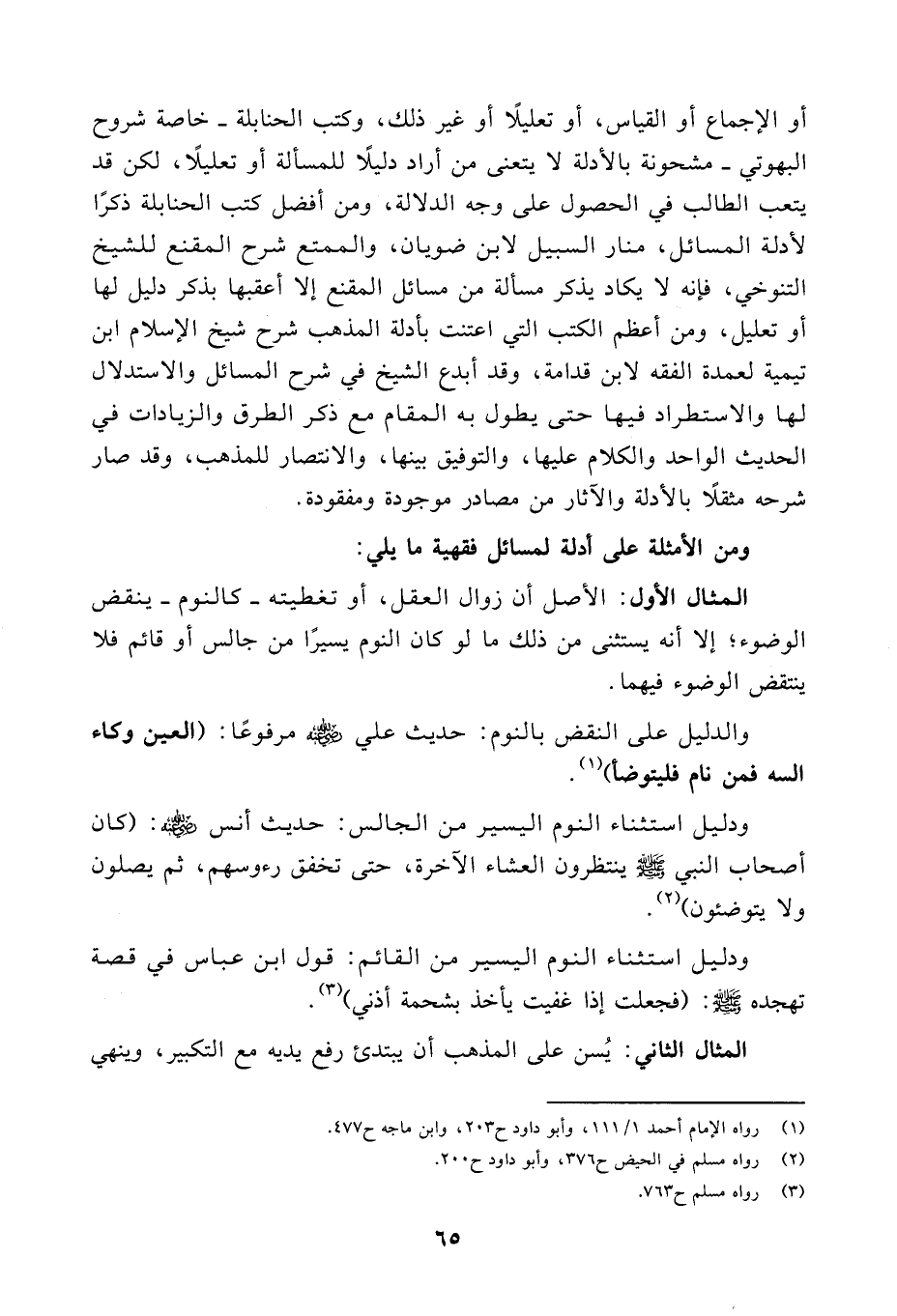 أو الإجماع أو القياس، أو تعليلاً أو غير ذلك، وكتب الحنابلة -خاصة شروح البهوتي- مشحونة بالأدلة لا يتعنى من أراد دليلاً للمسألة أو تعليلاً، لكن قد يتعب الطالب في الحصول على وجه الدلالة، ومن أفضل كتب الحنابلة ذكراً لأدلة المسائل، منار السبيل لابن ضويان، والممتع شرح المقنع للشيخ التنوخي، فإنه لا يكاد يذكر مسألة من مسائل المقنع إلا أعقبها بذكر دليل لها أو تعليل، ومن أعظم الكتب التي اعتنت بأدلة المذهب شرح شيخ الإسلام ابن تيمية لعمدة الفقه لابن قدامة، وقد أبدع الشيخ في شرح المسائل والاستدلال لها والاستطراد فيها حتى يطول به المقام مع ذكر الطرق والزيادات في الحديث الواحد والكلام عليها، والتوفيق بينها، والانتصار للمذهب، وقد صار شرحه مثقلاً بالأدلة والآثار من مصادر موجودة ومفقودة.