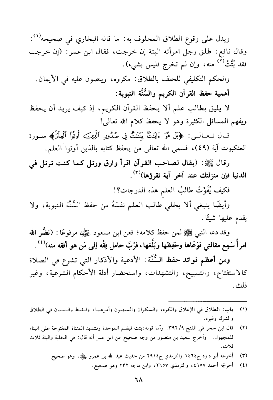 وقد دعا النبي صلى الله عليه وسلم لمن حفظ كلامه؛ فعن ابن مسعود رضي الله عنه مرفوعا: (نضَّر الله امرأً سَمِع مقالتي فوَعَاها وحَفِظها وبَلَّغها، فرُبَّ حامل فِقْه إلى مَن هو أفقه منه ((¬٤).