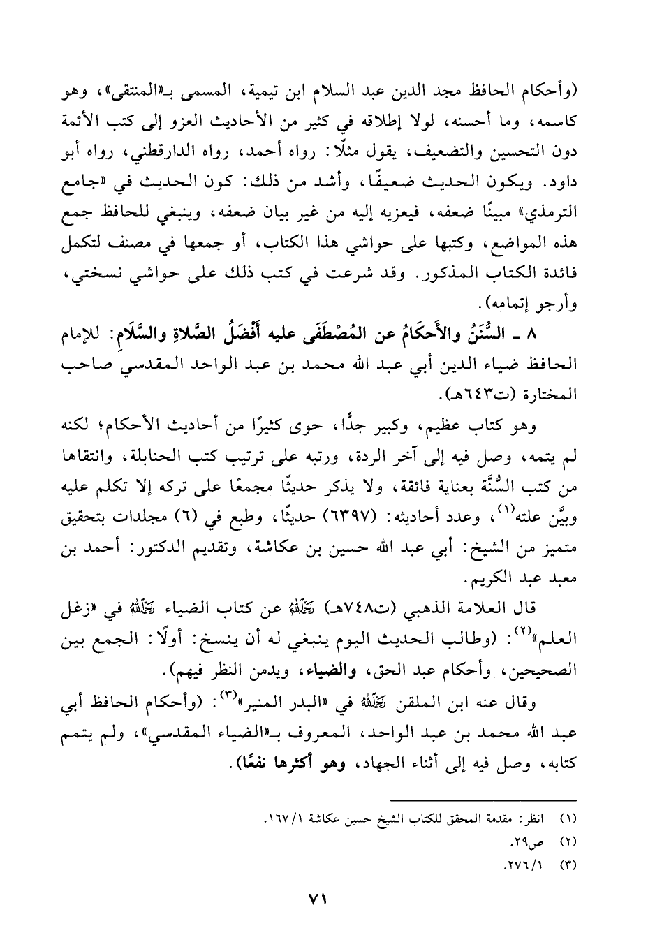 وقال عنه ابن الملقن - رحمه الله - في "البدر المنير" (¬٣): (وأحكام الحافظ أبي عبد الله محمد بن عبد الواحد، المعروف ب «الضياء المقدسي»، ولم يتمم كتابه، وصل فيه إلى أثناء الجهاد، وهو أكثرها نفعا).