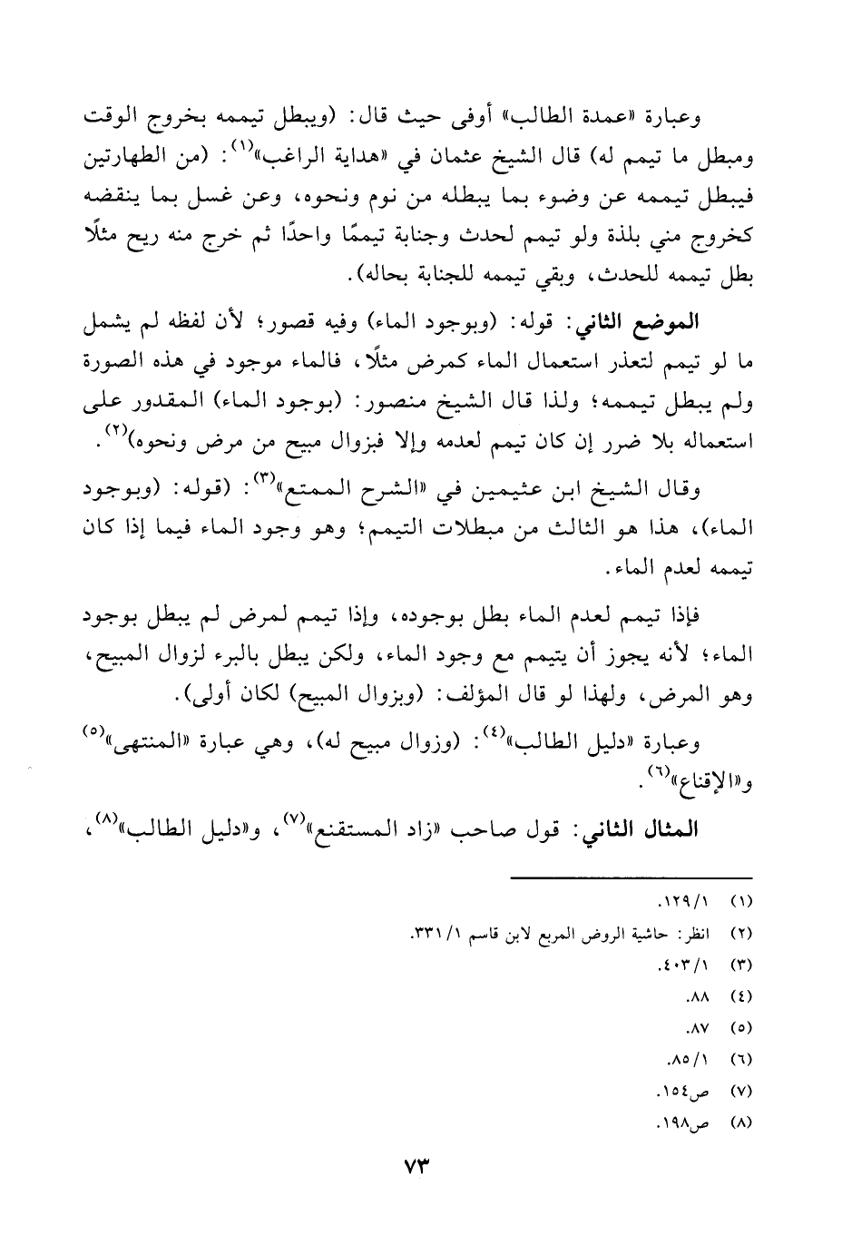 الموضع الثاني: قوله (وبوجود الماء) وفيه قصور؛ لأن لفظه لم يشمل ما لو تيمم لتعذر استعمال الماء كمرض مثلا، فالماء موجود في هذه الصورة ولم يبطل تيممه؛ ولذا قال الشيخ منصور: (بوجود الماء) المقدور على استعماله بلا ضرر إن كان تيمم لعدمه وإلا فبزوال مبيح من مرض ونحوه) (¬٢).