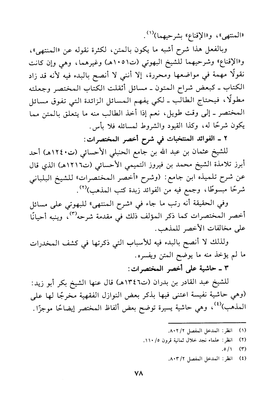 وبالفعل هذا شرح أشبه ما يكون بالمتن، لكثرة نقوله عن " المنتهى"، و"الإقناع" وشرحيهما للشيخ البهوتي (ت ١٠٥١ هـ) وغيرهما، وهي وإن كانت نقولاً مهمة في مواضعها ومحررة، إلا أنني لا أنصح بالبدء فيه لأنه قد زاد الكتاب- كبعض شراح المتون- مسائل أثقلت الكتاب المختصر وجعلته مطولاً، فيحتاج الطالب - لكي يفهم المسائل الزائدة التي تفوق مسائل المختصر - إلى وقت طويل، نعم إذا أخذ الطالب منه ما يتعلق بالمتن مما يكون شرحاً له، وكذا القيود والشروط لمسائله فلا بأس.