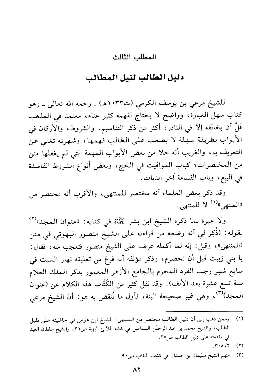 (¬١) وممن ذهب إلى أن دليل الطالب مختصر من المنتهى: الشيخ ابن عوض في حاشيته على دليل الطالب، والشيخ محمد بن عبدالرحمن السماعيل في كتابه اللآلئ البهية ص ٣١، والشيخ سلطان العيد في مقدمته على دليل الطالب ص ٢٧.