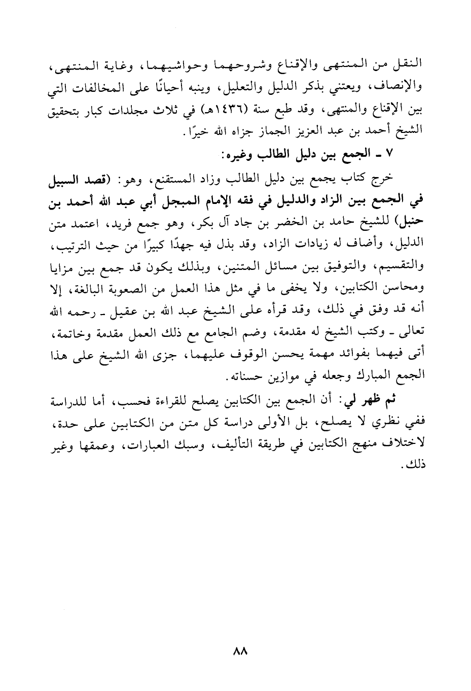 خرج كتاب يجمع بين دليل الطالب وزاد المستقنع، وهو: (قصد السبيل في الجمع بين الزاد والدليل في فقه الإمام المبجل أبي عبدالله أحمد بن حنبل) للشيخ حامد بن الخضر بن جاد آل بكر، وهو جمع فريد، اعتمد متن الدليل، وأضاف له زيادات الزاد، وقد بذل فيه جهداً كبيراً من حيث الترتيب، والتقسيم، والتوفيق بين مسائل المتنين، وبذلك يكون قد جمع بين مزايا ومحاسن الكتابين، ولا يخفى ما في مثل هذا العمل من الصعوبة البالغة، إلا أنه قد وفق في ذلك، وقد قرأه على الشيخ عبدالله بن عقيل - رحمه الله تعالى- وكتب الشيخ له مقدمة، وضم الجامع مع ذلك العمل مقدمة وخاتمة، أتى فيهما بفوائد مهمة يحسن الوقوف عليهما، جزى الله الشيخ على هذا الجمع المبارك وجعله في موازين حسناته.