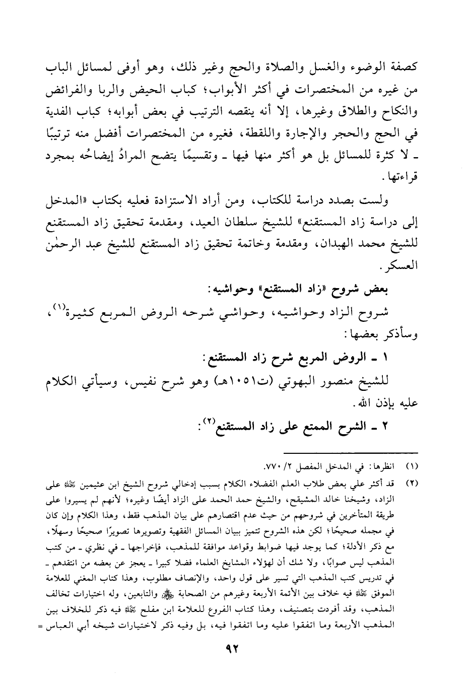 (¬٢) قد أكثر علي بعض طلاب العلم الفضلاء الكلام بسبب إدخالي شروح الشيخ ابن عثيمين رحمه الله على الزاد، وشيخنا خالد المشيقح، والشيخ حمد الحمد على الزاد أيضا وغيره؛ لأنهم لم يسيروا على طريقة المتأخرين في شروحهم من حيث عدم اقتصارهم على بيان المذهب فقط، وهذا الكلام وإن كان في مجمله صحيحا؛ لكن هذه الشروح تتميز ببيان المسائل الفقهية وتصويرها تصويرا صحيحا وسهلا، مع ذكر الأدلة؛ كما يوجد فيها ضوابط وقواعد موافقة للمذهب، فإخراجها - في نظري - من كتب المذهب ليس صوابا، ولاشك أن لهؤلاء المشايخ العلماء فضلا كبيرا - يعجز عن بعضه من انتقدهم - في تدريس كتب المذهب التي تسير على قول واحد، والإنصاف مطلوب، وهذا كتاب المغني للعلامة الموفق رحمه الله فيه خلاف بين الأئمة الأربعة وغيرهم من الصحابة رضي الله عنهم والتابعين، وله اختيارات تخالف المذهب، وقد أفردت بتصنيف، وهذا كتاب الفروع للعلامة ابن مفلح رحمه الله فيه ذكر للخلاف بين المذهب الأربعة وما اتفقوا عليه وما اتفقوا فيه، بل وفيه ذكر لاختيارات شيخه أبي العباس شيخ الإسلام ابن تيمية رحمه الله التي تخالف المذاهب الأربعة مع تعقب له على شيخه رحمهما الله تعالى، وهذا كتاب التنقيح ذكر فيه المنقح مسائل على المذهب، وحكما آخر لها يخالف المذهب ويستظهرها أحيانا، وهذا كتاب الإقناع ذكر أكثر من مائة مسألة تخالف المذهب بعد التصريح بالمذهب، فلا يخلو كتاب من ذكر خلاف ولو في بعض مسائله؛ نعم ليس ذلك ظاهرا فيها لكن وجد فيها والله أعلم.
