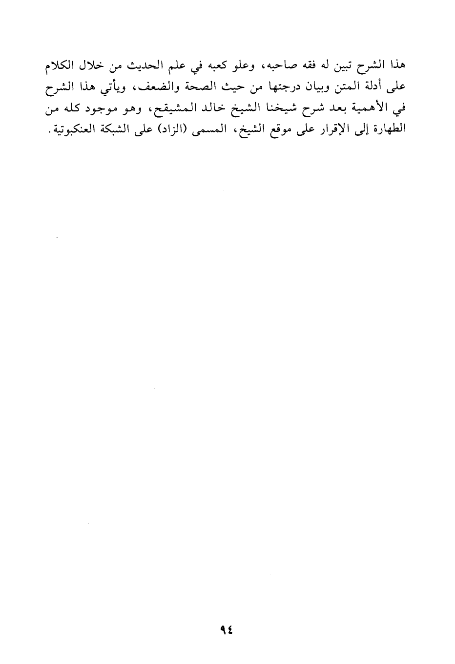 هذا الشرح تبين له فقه صاحبه، وعلو كعبه في علم الحديث من خلال الكلام على أدلة المتن وبيان درجتها من حيث الصحة والضعف، ويأتي هذا الشرح في الأهمية بعد شرح شيخنا الشيخ خالد المشيقح، وهو موجود كله من الطهارة إلى الإقرار على موقع الشيخ، المسمى (الزاد) على الشبكة العنكبوتية.
