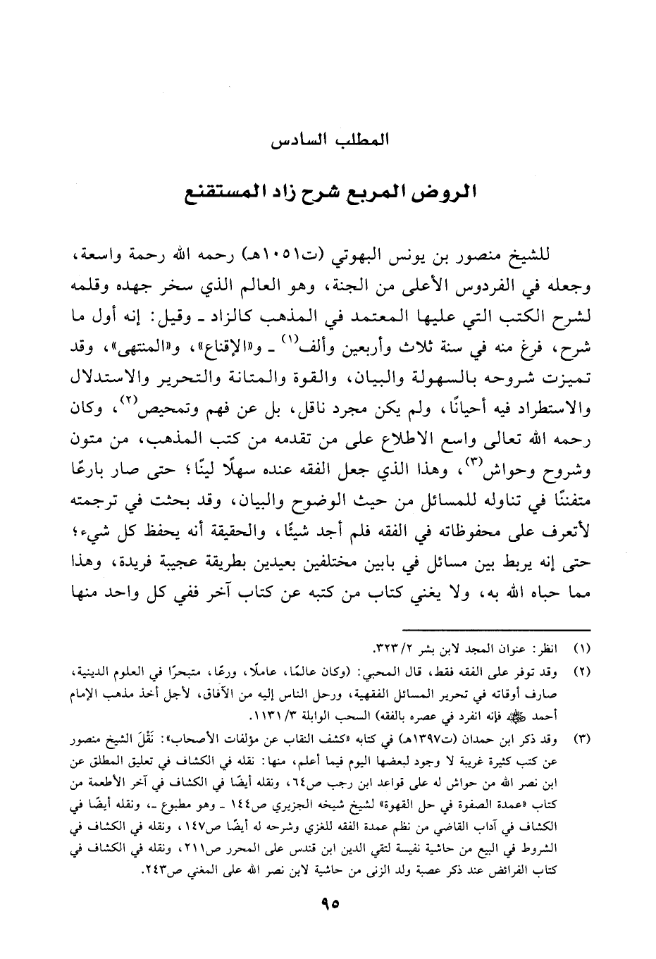 للشيخ منصور بن يونس البهوتي (ت ١٠٥١ هـ) رحمه الله رحمة واسعة، وجعله في الفردوس الأعلى من الجنة، وهو العالم الذي سخر جهده وقلمه لشرح الكتب التي عليها المعتمد في المذهب كالزاد - وقيل: إنه أول ما شرح، فرغ منه في سنة ثلاث وأربعين وألف (¬١) - و " الإقناع"، و"المنتهى "، وقد تميزت شروحه بالسهولة والبيان، والقوة والمتانة والتحرير والاستدلال والاستطراد فيه أحيانا، ولم يكن مجرد ناقل، بل عن فهم وتمحيص (¬٢)، وكان رحمه الله تعالى واسع الاطلاع على من تقدمه من كتب المذهب، من متون وشروح وحواش (¬٣)،