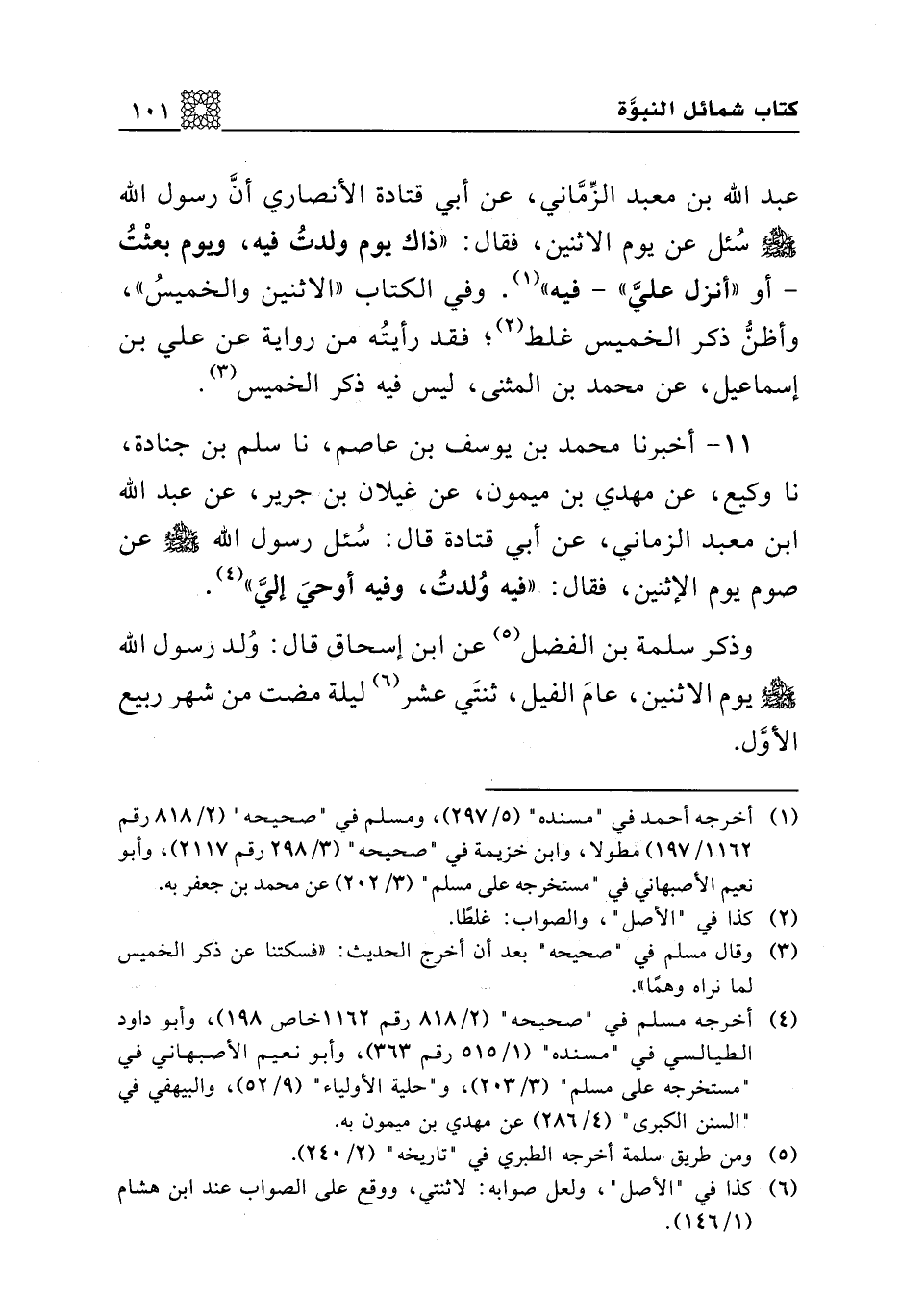 11 - أخبرنا محمد بن يوسف بن عاصم، نا سلم بن جنادة، نا وكيع، عن مهدي بن ميمون، عن غيلان بن جرير، عن عبد الله بن معبد الزماني، عن أبي قتادة قال: سئل رسول الله صلى الله عليه وسلم عن صوم يوم الإثنين، فقال: "فيه ولدت، وفيه أوحي إلي".