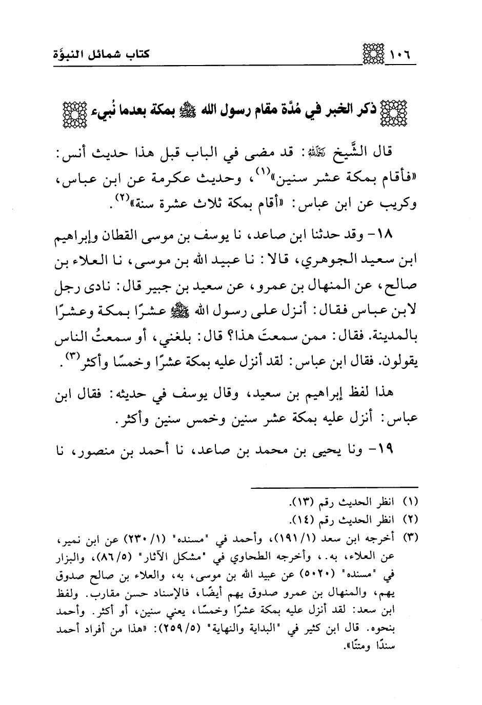 قال الشيخ رحمه الله: قد مضى في الباب قبل هذا حديث أنس: "فأقام بمكة عشر سنين"، وحديث عكرمة عن ابن عباس، وكريب عن ابن عباس: "أقام بمكة ثلاث عشرة سنة".