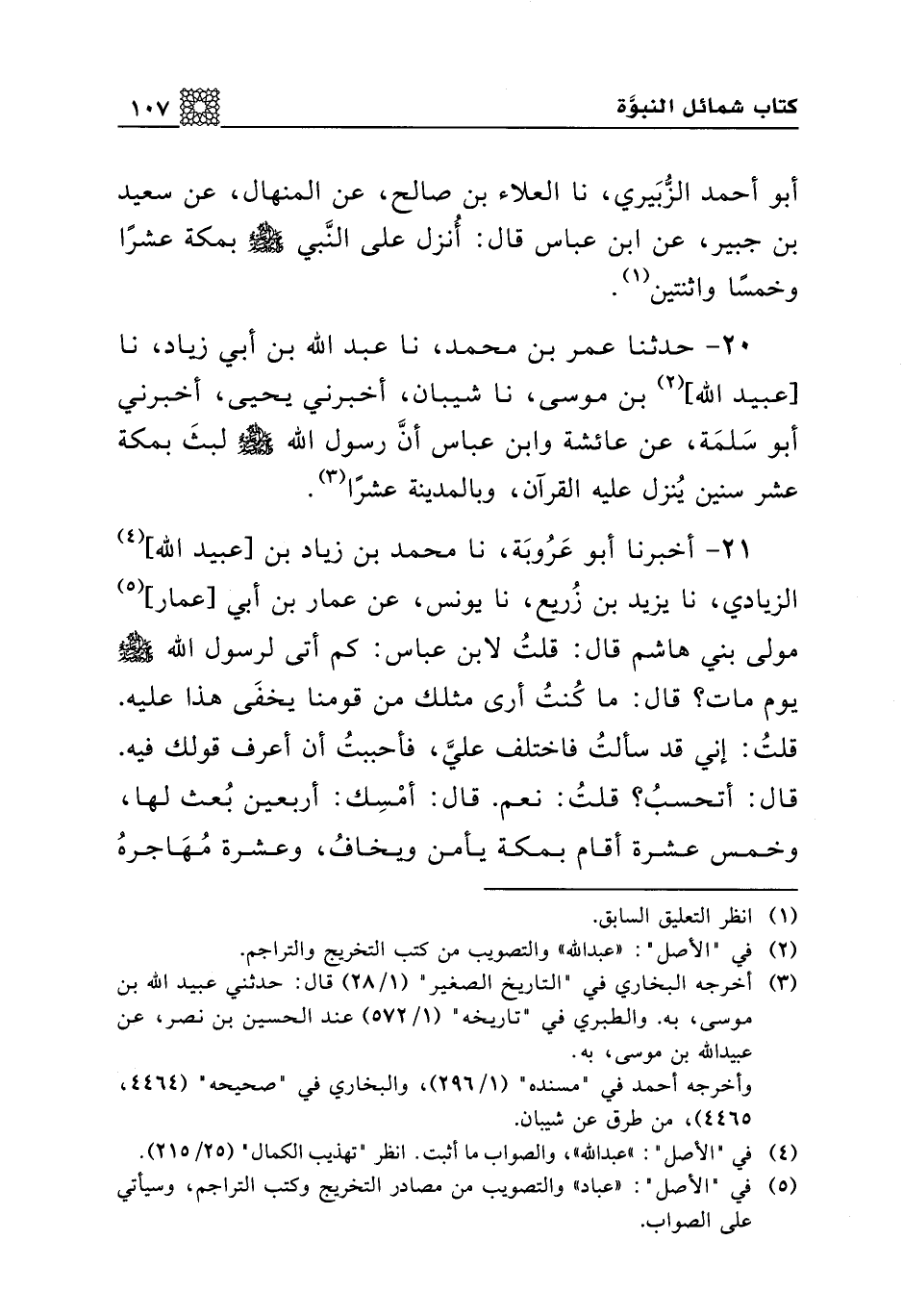 21 - أخبرنا أبو عروبة، نا محمد بن زياد بن [عبيد الله] الزيادي، نا يزيد بن زريع، نا يونس، عن عمار بن أبي [عمار] مولى بني هاشم قال: قلت لابن عباس: كم أتى لرسول الله صلى الله عليه وسلم يوم مات؟ قال: ما كنت أرى مثلك من قومنا يخفى هذا عليه. قلت: إني قد سألت فاختلف علي، فأحببت أن أعرف قولك فيه. قال: أتحسب؟ قلت: نعم. قال: أمسك: أربعين بعث لها، وخمس عشرة أقام بمكة يأمن ويخاف، وعشرة مهاجره بالمدينة.