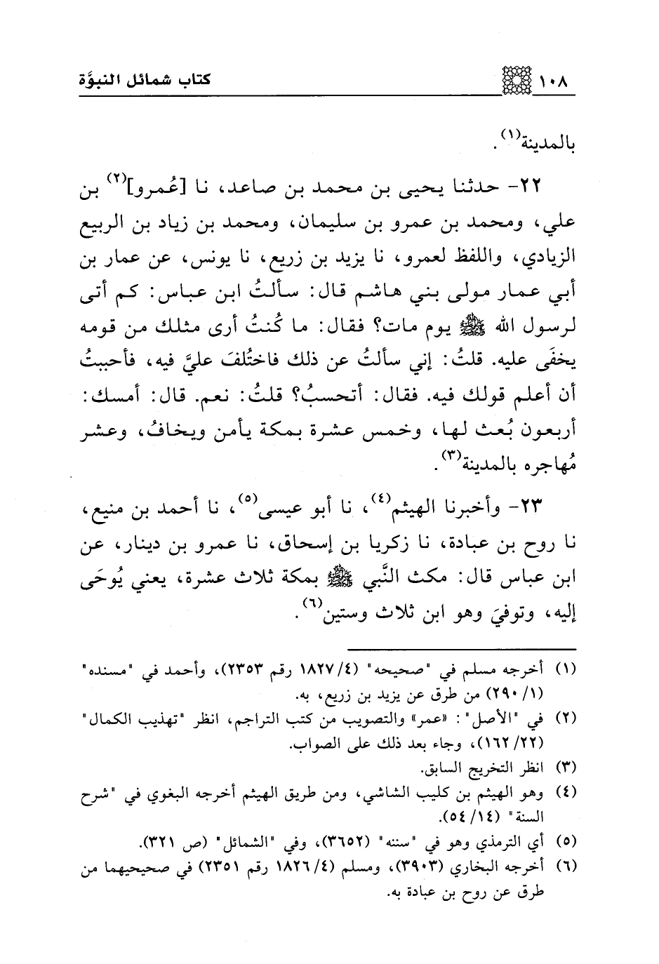 23 - وأخبرنا الهيثم، نا أبو عيسى، نا أحمد بن منيع، نا روح بن عبادة، نا زكريا بن إسحاق، نا عمرو بن دينار، عن ابن عباس قال: مكث النبي صلى الله عليه وسلم بمكة ثلاث عشرة، يعني يوحى إليه، وتوفي وهو ابن ثلاث وستين.