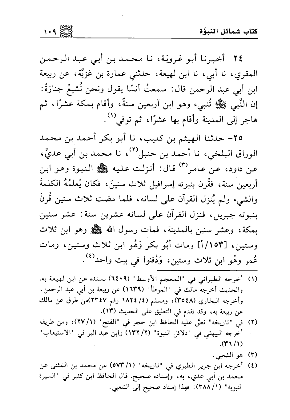 25 - حدثنا الهيثم بن كليب، نا أبو بكر أحمد بن محمد الوراق البلخي، نا أحمد بن حنبل، نا محمد بن أبي عدي، عن داود، عن عامر قال: أنزلت عليه صلى الله عليه وسلم النبوة وهو ابن أربعين سنة، فقرن بنبوته إسرافيل ثلاث سنين، فكان يعلمه الكلمة والشيء ولم ينزل القرآن على لسانه، فلما مضت ثلاث سنين قرن بنبوته جبريل، فنزل القرآن على لسانه عشرين سنة: عشر سنين بمكة، وعشر سنين بالمدينة، فمات رسول الله صلى الله عليه وسلم وهو ابن ثلاث وستين، ومات أبو بكر وهو ابن ثلاث وستين، ومات عمر وهو ابن ثلاث وستين، ودفنوا في بيت واحد.