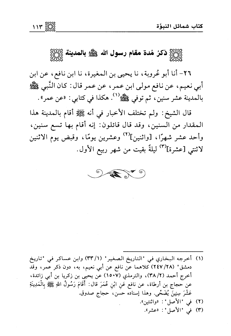 26 - أنا أبو عروبة، نا يحيى بن المغيرة، نا ابن نافع، عن ابن أبي نعيم، عن نافع مولى ابن عمر، عن عمر قال: كان النبي صلى الله عليه وسلم بالمدينة عشر سنين، ثم توفي صلى الله عليه وسلم. هكذا في كتابي: "عن عمر".
