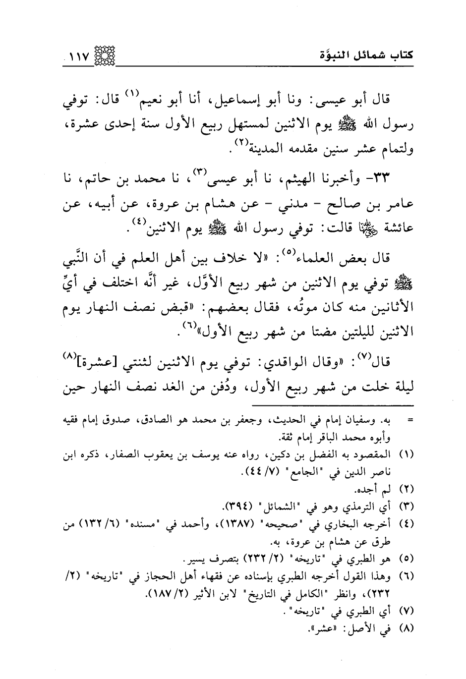 33 - وأخبرنا الهيثم، نا أبو عيسى، نا محمد بن حاتم، نا عامر بن صالح -مدني- عن هشام بن عروة، عن أبيه، عن عائشة رضي الله عنها قالت: توفي رسول الله صلى الله عليه وسلم يوم الاثنين. قال بعض العلماء: "لا خلاف بين أهل العلم في أن النبي صلى الله عليه وسلم توفي يوم الاثنين من شهر ربيع الأول، غير أنه اختلف في أي الأثانين منه كان موته، فقال بعضهم: "قبض نصف النهار يوم الاثنين لليلتين مضتا من شهر ربيع الأول". قال: "وقال الواقدي: توفي يوم الاثنين لثنتي [عشرة] ليلة خلت من شهر ربيع الأول، ودفن من الغد نصف النهار حين زاغت الشمس، وذلك يوم الثلاثاء".