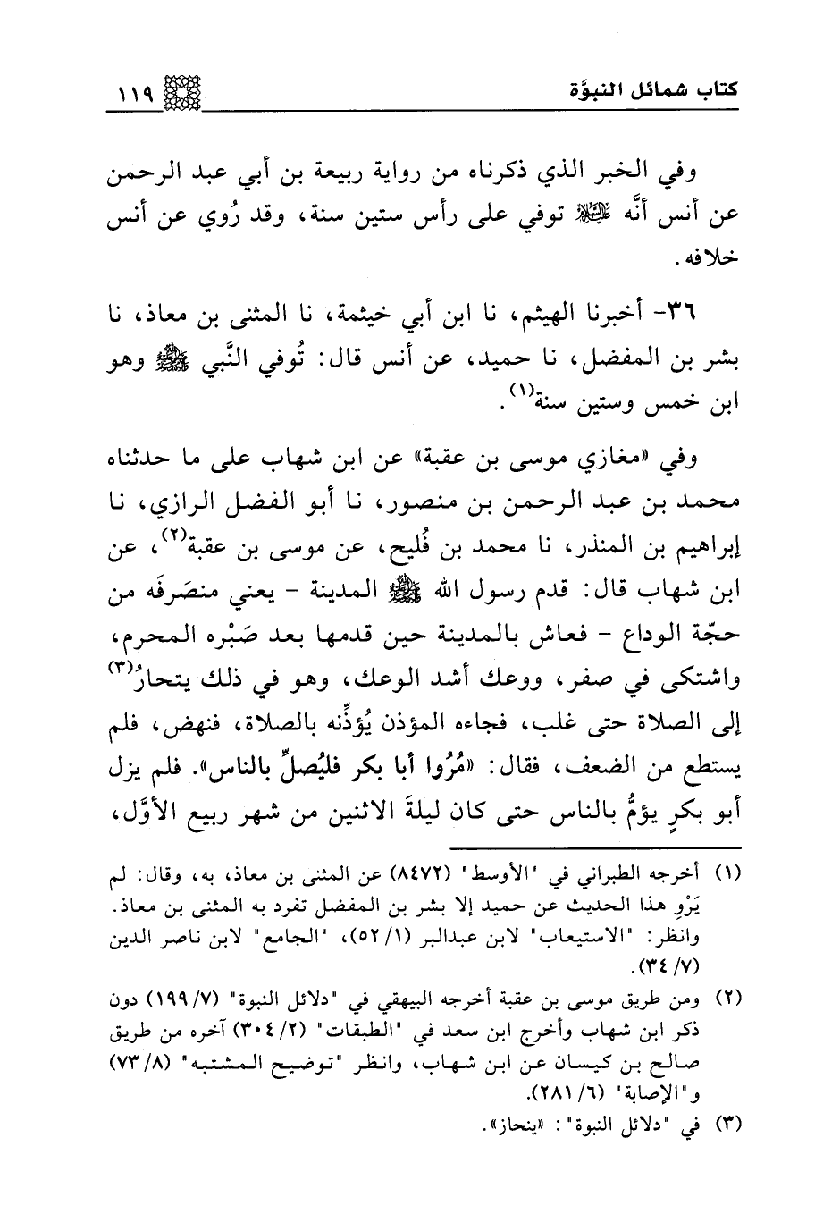 36 - أخبرنا الهيثم، نا ابن أبي خيثمة، نا المثنى بن معاذ، نا بشر بن المفضل، نا حميد، عن أنس قال: توفي النبي صلى الله عليه وسلم وهو ابن خمس وستين سنة. وفي "مغازي موسى بن عقبة" عن ابن شهاب على ما حدثناه محمد بن عبد الرحمن بن منصور، نا أبو الفضل الرازي، نا إبراهيم بن المنذر، نا محمد بن فليح، عن موسى بن عقبة، عن ابن شهاب قال: قدم رسول الله صلى الله عليه وسلم المدينة -يعني منصرفه من حجة الوداع- فعاش بالمدينة حين قدمها بعد صبره المحرم، واشتكى في صفر، ووعك أشد الوعك، وهو في ذلك يتحار إلى الصلاة حتى غلب، فجاءه المؤذن يؤذنه بالصلاة، فنهض، فلم يستطع من الضعف، فقال: "مروا أبا بكر فليصل بالناس". فلم يزل أبو بكر يؤم بالناس حتى كان ليلة الاثنين من شهر ربيع الأول، فأقلع عن رسول الله صلى الله عليه وسلم الوعك، وأصبح مفيقا، فغدا إلى الصلاة يتوكأ على الفضل بن عباس وعلى غلام له يدعى ثوبان.