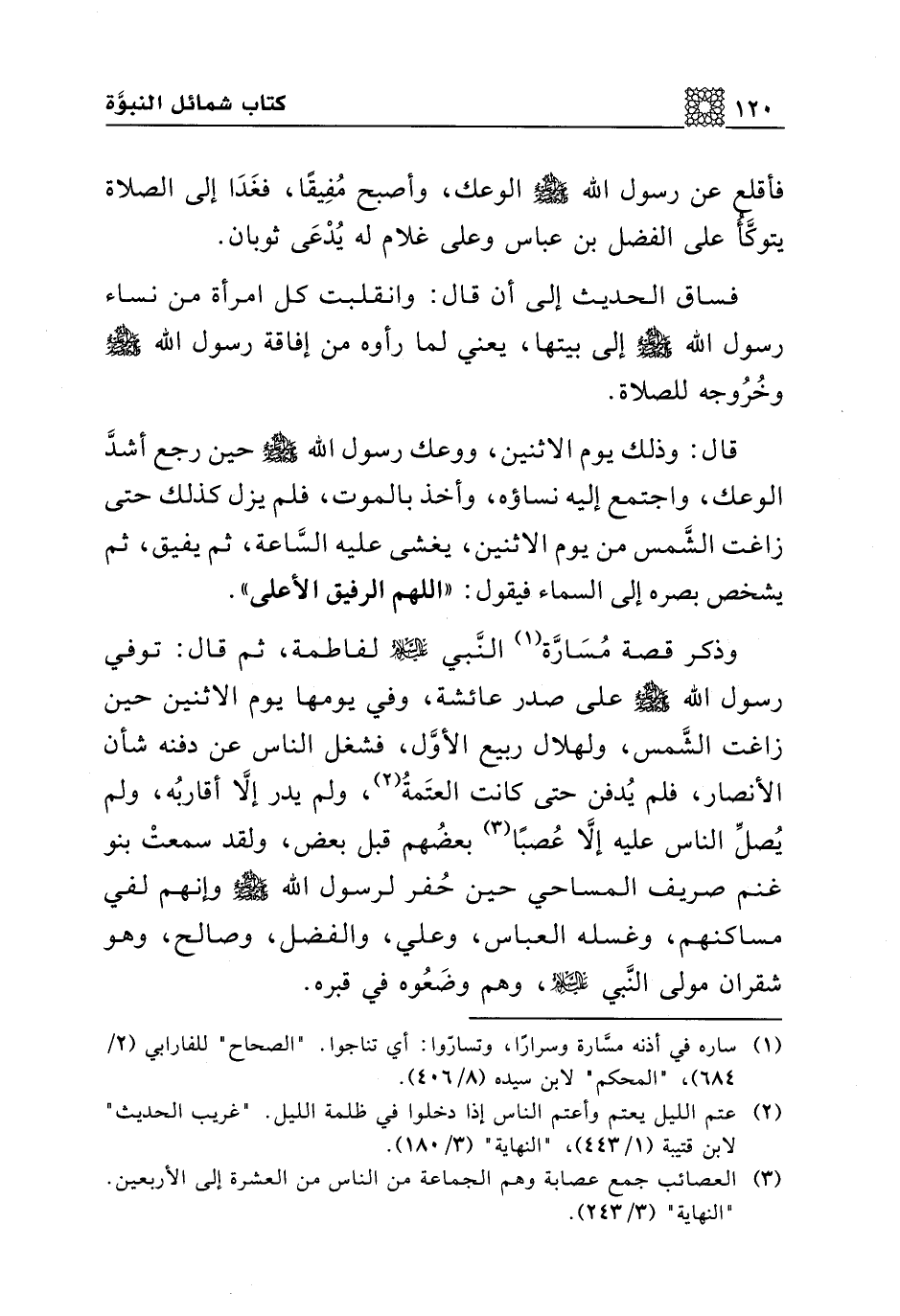 وذكر قصة مسارة النبي عليه السلام لفاطمة، ثم قال: توفي رسول الله صلى الله عليه وسلم على صدر عائشة، وفي يومها يوم الاثنين حين زاغت الشمس، ولهلال ربيع الأول، فشغل الناس عن دفنه شأن الأنصار، فلم يدفن حتى كانت العتمة، ولم يدر إلا أقاربه، ولم يصل الناس عليه إلا عصبا بعضهم قبل بعض، ولقد سمعت بنو غنم صريف المساحي حين حفر لرسول الله صلى الله عليه وسلم وإنهم لفي مساكنهم، وغسله العباس، وعلي، والفضل، وصالح، وهو شقران مولى النبي عليه السلام، وهم وضعوه في قبره.