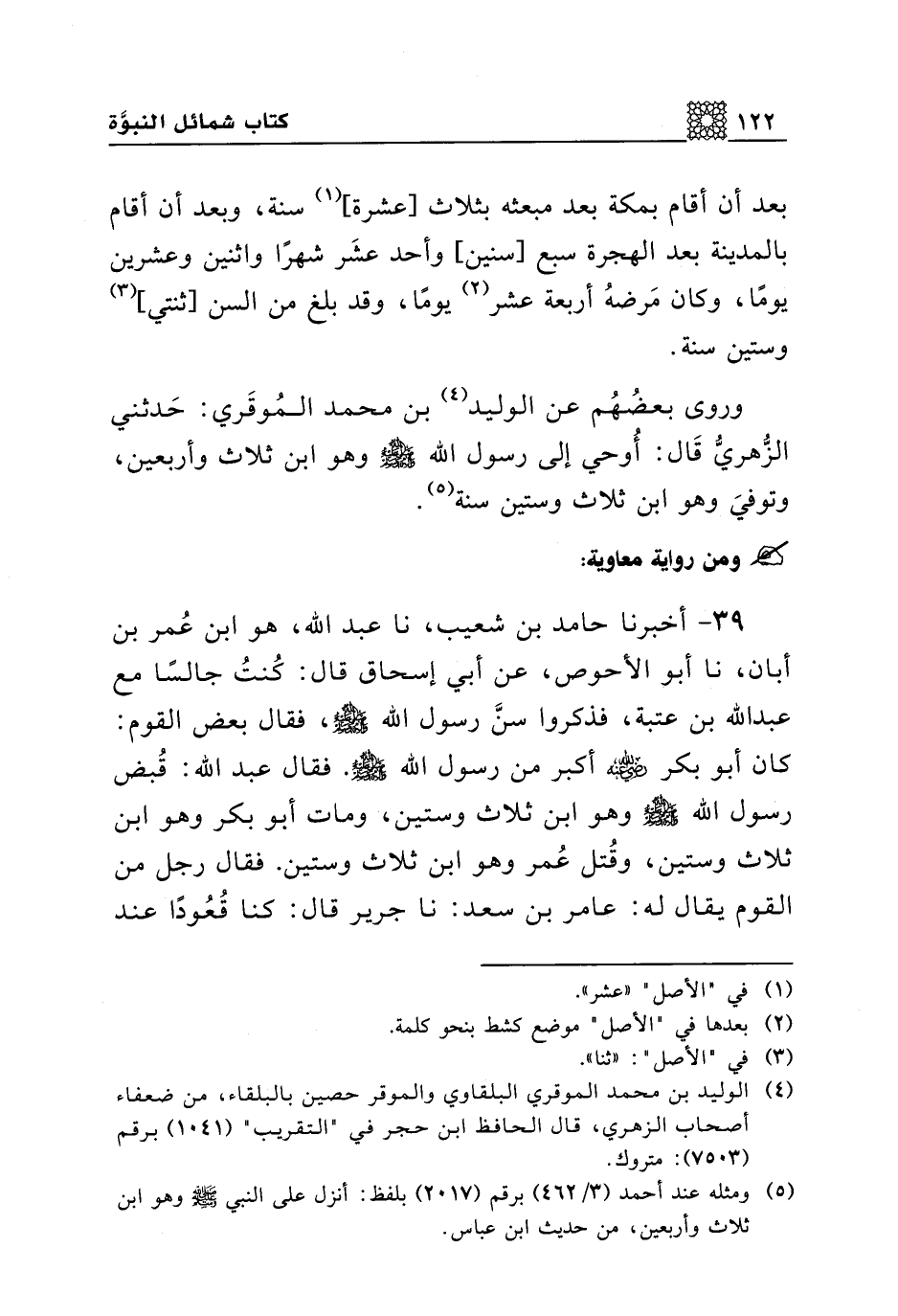 39 - أخبرنا حامد بن شعيب، نا عبد الله، هو ابن عمر بن أبان، نا أبو الأحوص، عن أبي إسحاق قال: كنت جالسا مع عبد الله بن عتبة، فذكروا سن رسول الله صلى الله عليه وسلم، فقال بعض القوم: كان أبو بكر رضي الله عنه أكبر من رسول الله صلى الله عليه وسلم. فقال عبد الله: قبض رسول الله صلى الله عليه وسلم وهو ابن ثلاث وستين، ومات أبو بكر وهو ابن ثلاث وستين، وقتل عمر وهو ابن ثلاث وستين. فقال رجل من القوم يقال له: عامر بن سعد: نا جرير قال: كنا قعودا عند معاوية، فقال معاوية: قبض رسول الله صلى الله عليه وسلم وهو ابن ثلاث وستين، ومات أبو بكر وهو ابن ثلاث وستين، وقتل عمر وهو ابن ثلاث وستين.