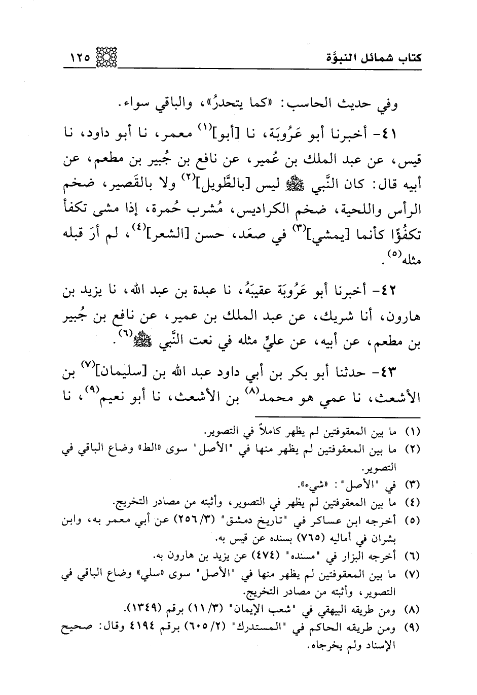 41 - أخبرنا أبو عروبة، نا [أبو] معمر، نا أبو داود، نا قيس، عن عبد الملك بن عمير، عن نافع بن جبير بن مطعم، عن أبيه قال: كان النبي صلى الله عليه وسلم ليس [بالطويل] ولا بالقصير، ضخم الرأس واللحية، ضخم الكراديس، مشرب حمرة، إذا مشى تكفأ تكفؤا كأنما [يمشي] في صعد، حسن [الشعر]، لم أر قبله مثله.