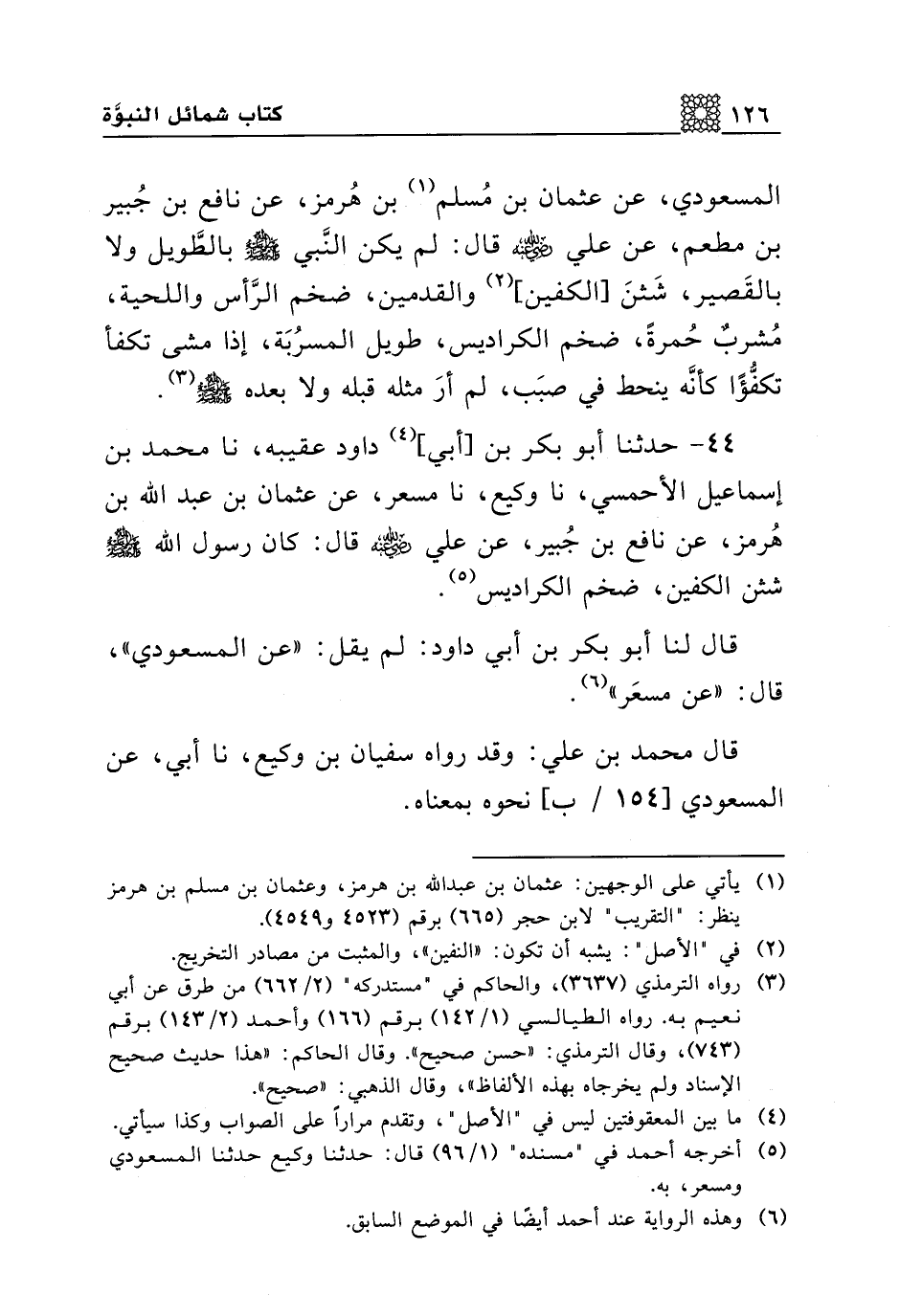 44 - حدثنا أبو بكر بن [أبي] داود عقيبه، نا محمد بن إسماعيل الأحمسي، نا وكيع، نا مسعر، عن عثمان بن عبد الله بن هرمز، عن نافع بن جبير، عن علي رضي الله عنه قال: كان رسول الله صلى الله عليه وسلم شثن الكفين، ضخم الكراديس.