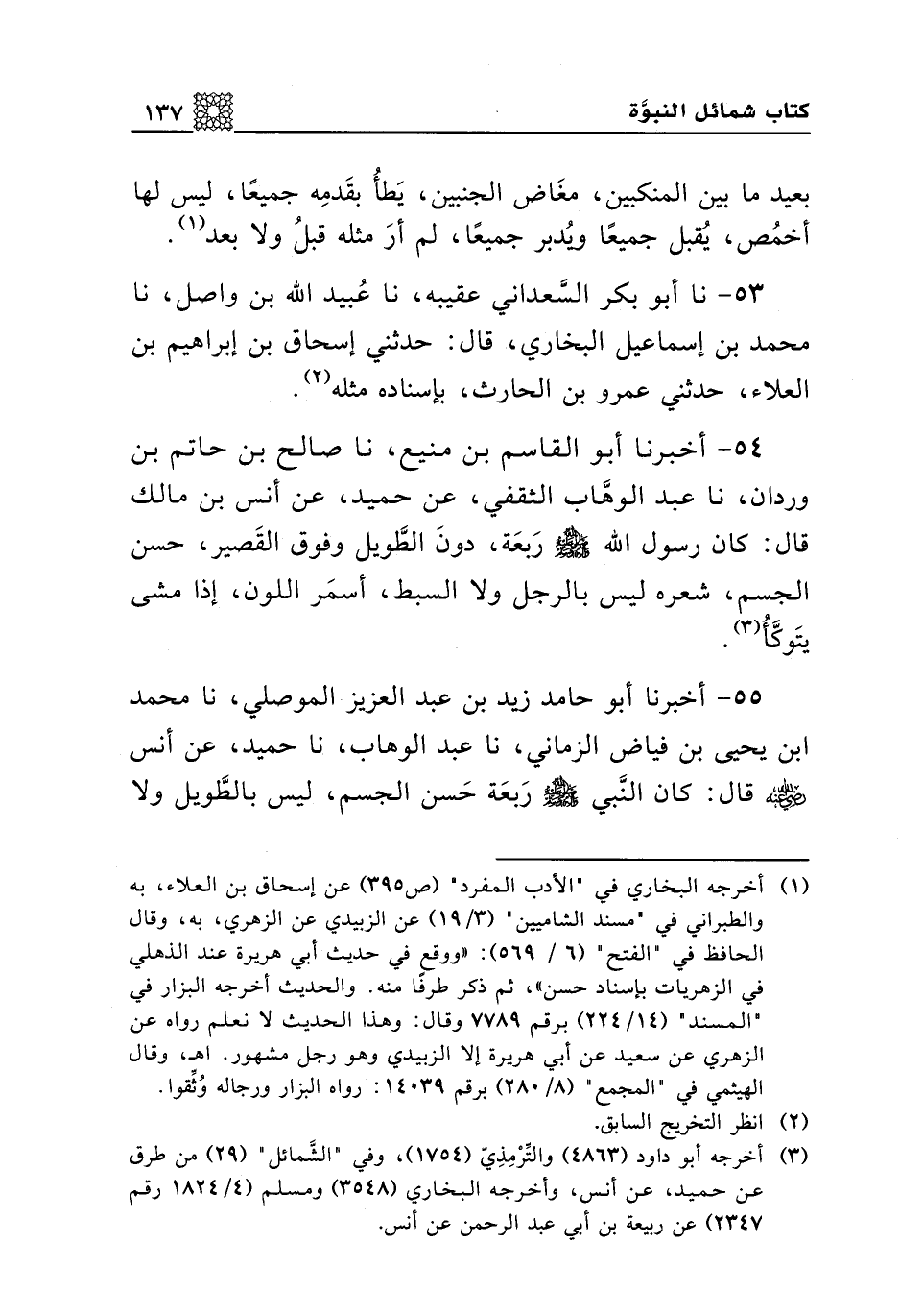 55 - أخبرنا أبو حامد زيد بن عبد العزيز الموصلي، نا محمد بن يحيى بن فياض الزماني، نا عبد الوهاب، نا حميد، عن أنس رضي الله عنه قال: كان النبي صلى الله عليه وسلم ربعة حسن الجسم، ليس بالطويل ولا بالقصير، وشعره ليس بالسبط ولا الجعد، أسمر اللون، إذا مشى توكأ.