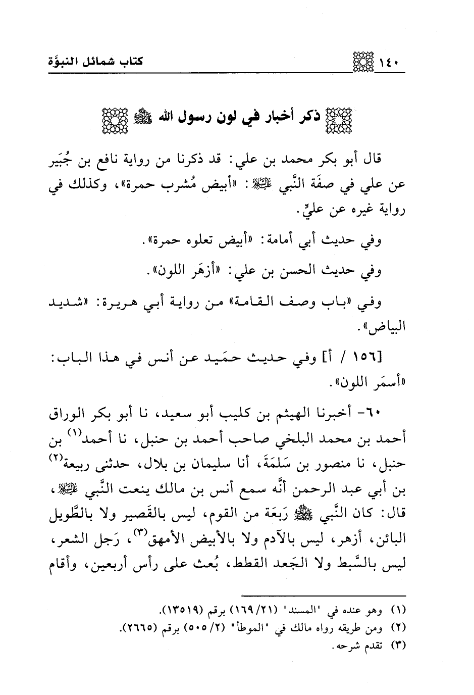 60 - أخبرنا الهيثم بن كليب أبو سعيد، نا أبو بكر الوراق أحمد بن محمد البلخي صاحب أحمد بن حنبل، نا أحمد بن حنبل، نا منصور بن سلمة، أنا سليمان بن بلال، حدثني ربيعة بن أبي عبد الرحمن أنه سمع أنس بن مالك ينعت النبي عليه السلام، قال: كان النبي صلى الله عليه وسلم ربعة من القوم، ليس بالقصير ولا بالطويل البائن، أزهر، ليس بالآدم ولا بالأبيض الأمهق، رجل الشعر، ليس بالسبط، ولا الجعد القطط، بعث على رأس أربعين، وأقام بمكة عشرا، وبالمدينة عشرا، وتوفي على رأس ستين ليس في رأسه ولحيته عشرون شعرة بيضاء.