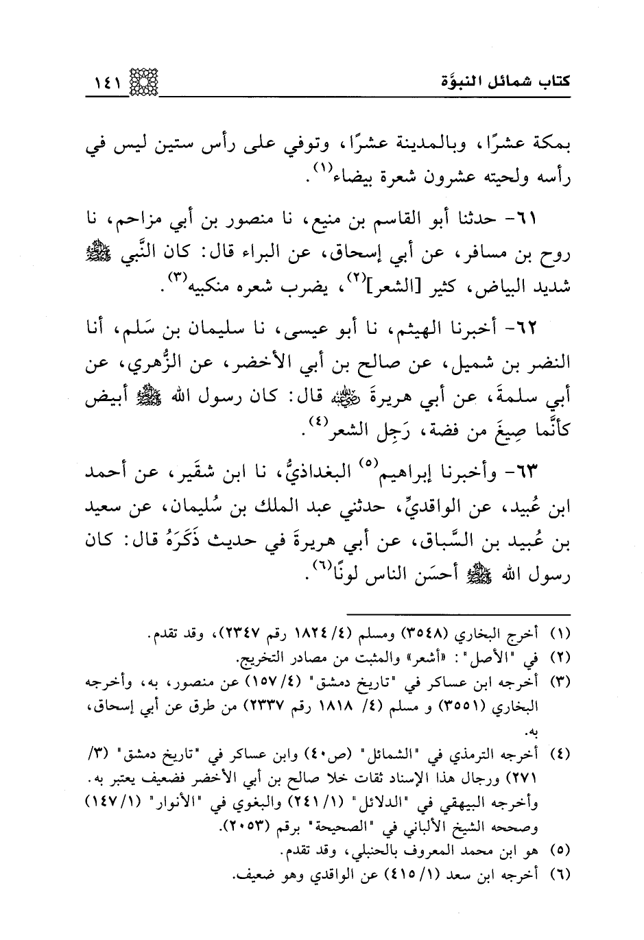 61 - حدثنا أبو القاسم بن منيع، نا منصور بن أبي مزاحم، نا روح بن مسافر، عن أبي إسحاق، عن البراء قال: كان النبي صلى الله عليه وسلم شديد البياض، كثير [الشعر]، يضرب شعره منكبيه.