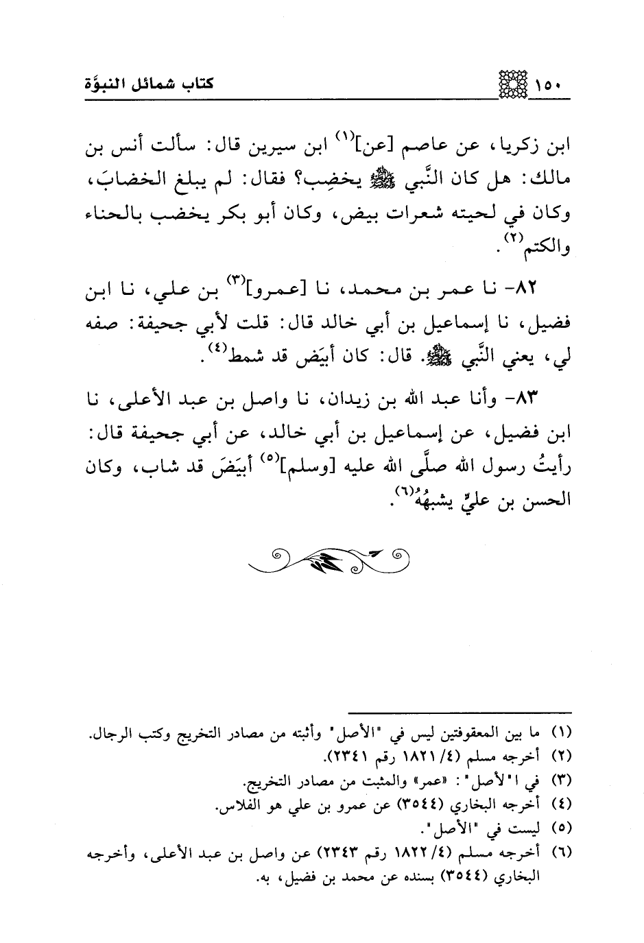 82 - نا عمر بن محمد، نا [عمرو] بن علي، نا ابن فضيل، نا إسماعيل بن أبي خالد قال: قلت لأبي جحيفة: صفه لي، يعني النبي صلى الله عليه وسلم. قال: كان أبيض قد شمط.