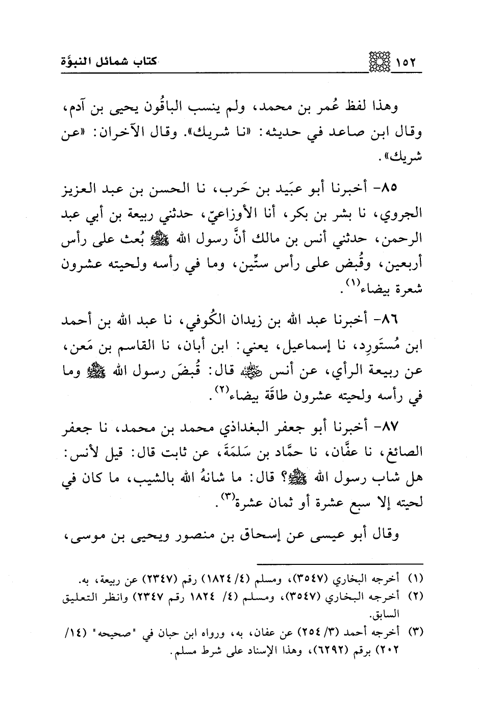 87 - أخبرنا أبو جعفر البغداذي محمد بن محمد، نا جعفر الصائغ، نا عفان، نا حماد بن سلمة، عن ثابت قال: قيل لأنس: هل شاب رسول الله صلى الله عليه وسلم؟ قال: ما شانه الله بالشيب، ما كان في لحيته إلا سبع عشرة أو ثمان عشرة.