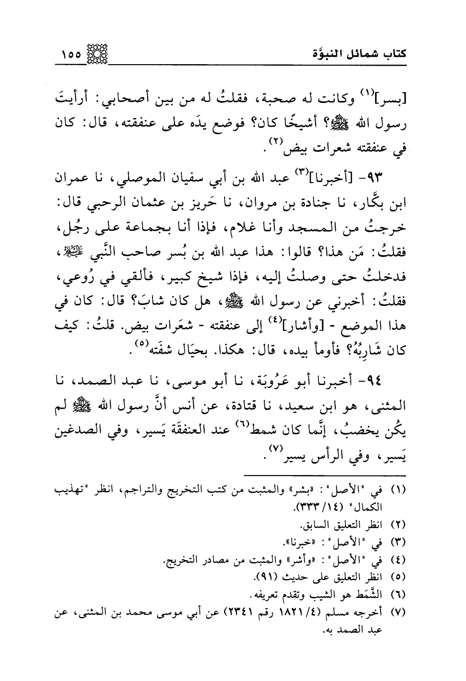 93 - [أخبرنا] عبد الله بن أبي سفيان الموصلي، نا عمران بن بكار، نا جنادة بن مروان، نا حريز بن عثمان الرحبي قال: خرجت من المسجد وأنا غلام، فإذا أنا بجماعة على رجل، فقلت: من هذا؟ قالوا: هذا عبد الله بن بسر صاحب النبي عليه السلام، فدخلت حتى وصلت إليه، فإذا شيخ كبير، فألقى في روعي، فقلت: أخبرني عن رسول الله صلى الله عليه وسلم، هل كان شاب؟ قال: كان في هذا الموضع-[وأشار] إلى عنفقته -شعرات بيض- قلت: كيف كان شاربه؟ فأومأ بيده، قال: هكذا. بحيال شفته.